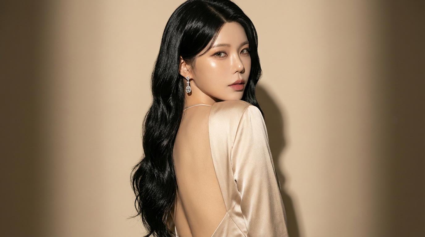 清楚でナチュラルな雰囲気の韓国アイドル風の女性。透き通るような白い肌で、自然な黒髪のストレートヘアはセンター分けの長さ。ふんわりとした前髪。やわらかく微笑んだ表情で、肌は艶やか。シンプルな黒い無地の服を着て、背景はグレーのスタジオ風。自然光ライティングで、落ち着いた雰囲気のポートレート