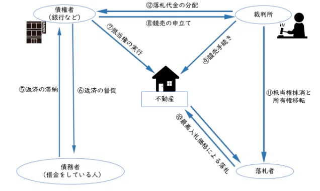 そして、返済が滞った物件を差し押さえて売るための、裁判所が行うオークションが競売です。この流れを図示したのが、下の図です。