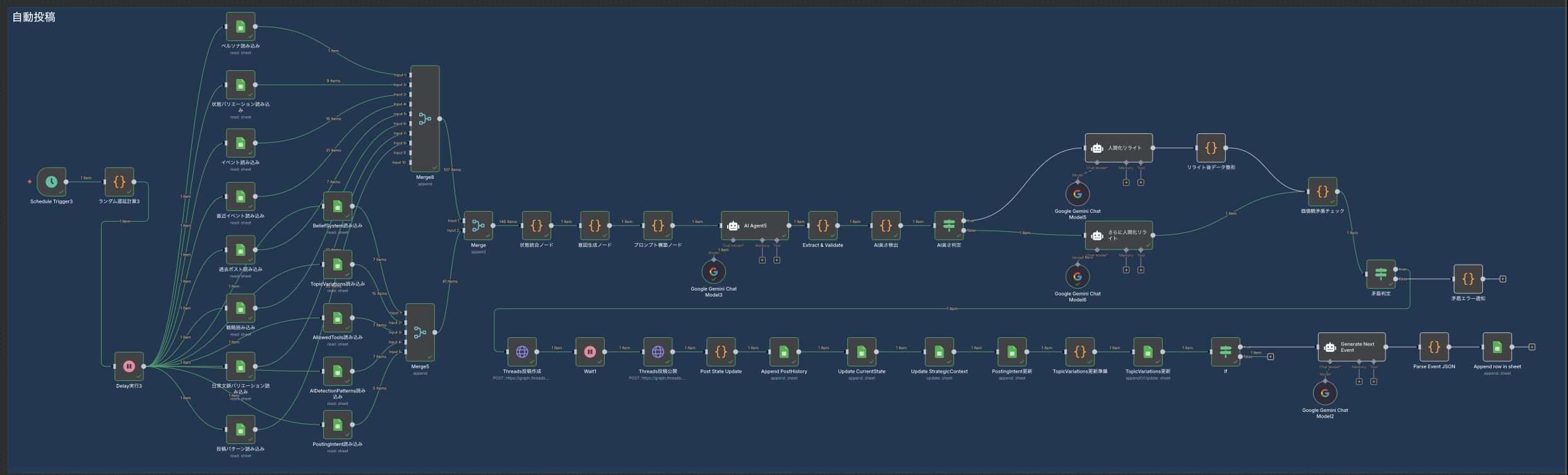 (たった1投稿作るのにこのくらいのフローを組んで「人間っぽさ」を徹底的に追求しました)