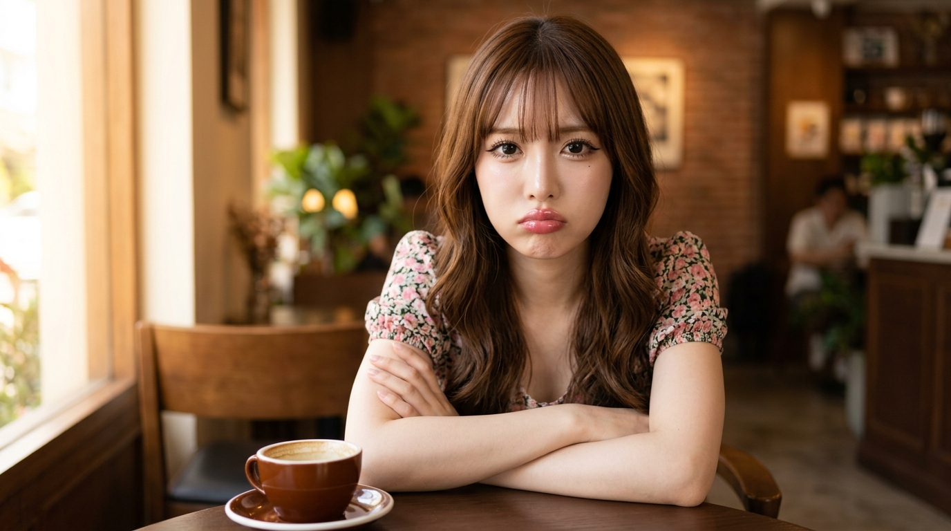 20-to-22-year-old Japanese date girlfriend beauty, 21-year-old, 158cm height, glaring at camera with pouty lips, arms crossed, clearly upset girlfriend, direct angry stare into lens, sitting across small cafe table, coffee cup pushed aside, arms crossed, cafe interior background, very large expressive eyes, sharp black eyeliner with extended cat-eye flick, prominent aegyo-sal, thick lower lash line, ultra glossy lids, fair porcelain skin, ultra glossy luminous texture, glass skin glow, flawless youthful complexion, plump glossy pink lips, wet shine, hydrated full volume, pout-ready appearance, long dark hair with soft waves, romantic natural movement, see-through thin bangs, Korean style, chestnut brown hair, warm natural shade, floral print mini dress with puff sleeves, sweet girly date style, close-up portrait shot, direct intense eye contact at camera, cozy indoor cafe, warm afternoon window light Negative prompt: multiple people, looking away, no eye contact, blurry, low quality, bad anatomy, distorted face, extra limbs, watermark, text, logo, old, mature, wrinkles, heavy makeup, oversaturated, noise, grain, poorly lit, out of frame