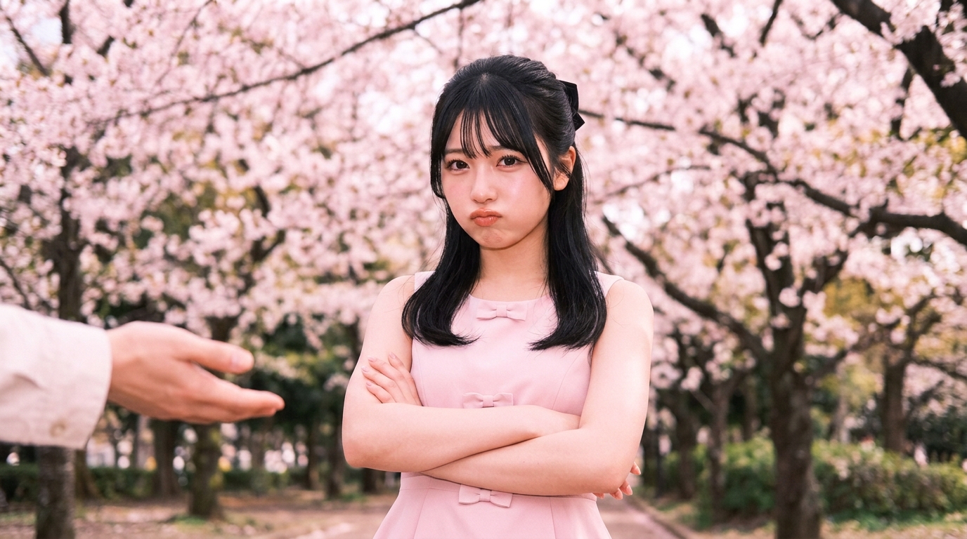0-to-22-year-old Japanese date girlfriend beauty, 20-year-old, 160cm height, sulking at camera with soft teary eyes, lips pushed out, adorable sulk, direct glossy-eyed gaze, standing under sakura trees, arms folded, ignoring outstretched hand, looking at camera, big doe eyes, defined black eyeliner top and bottom, plump pronounced tear duct bags, double eyelid crease, dewy sparkling finish, luminous fair skin, gleaming polished finish, soft-focus skin perfection, healthy glow, juicy glossy nude-pink lips, moist texture, natural fullness, beautifully pouty, black hair half-up half-down with small tie, romantic look, curtain bangs parted in center, trendy look, jet black hair, deep natural color, pastel pink A-line dress with bow detail, adorable girly spring, waist-up composition, full direct stare at viewer, cherry blossom park, soft pink-tinted natural spring light