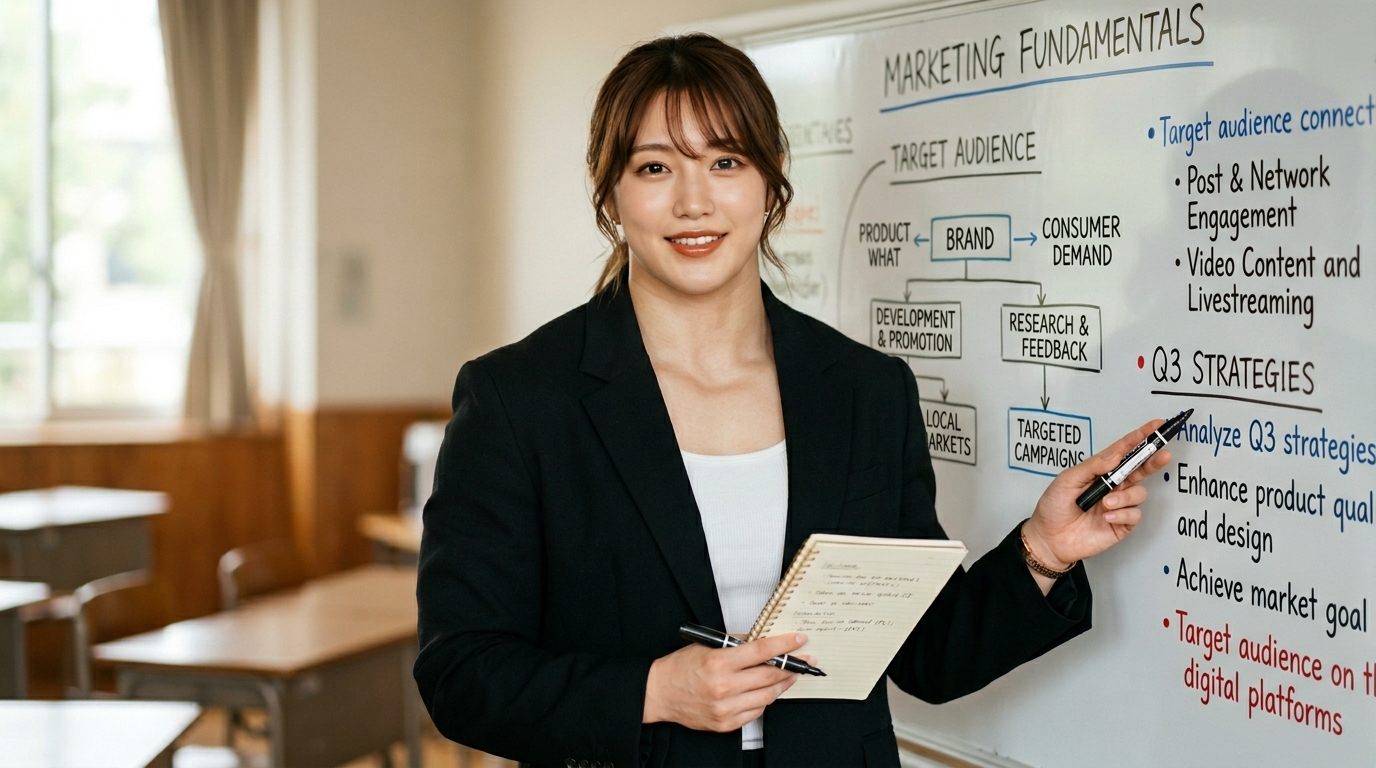 A Japanese woman in her early 20s, tall (around 170–179 cm), wearing a black suit with a white tank top and a necklace, standing in front of a whiteboard and speaking like a teacher, only one person in frame, with extremely broad shoulders exaggerated to be as wide as a man's and a very thick neck exaggerated to be wider than her face, possessing an athletic and exceptionally well-proportioned physique, large eyes, glossy lips, radiant smooth skin, with a contrasting gap in aura between appearance and presence.