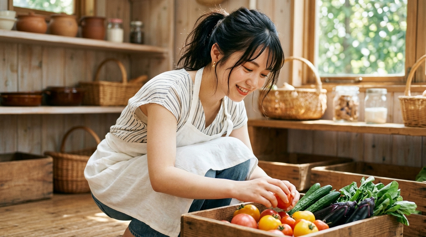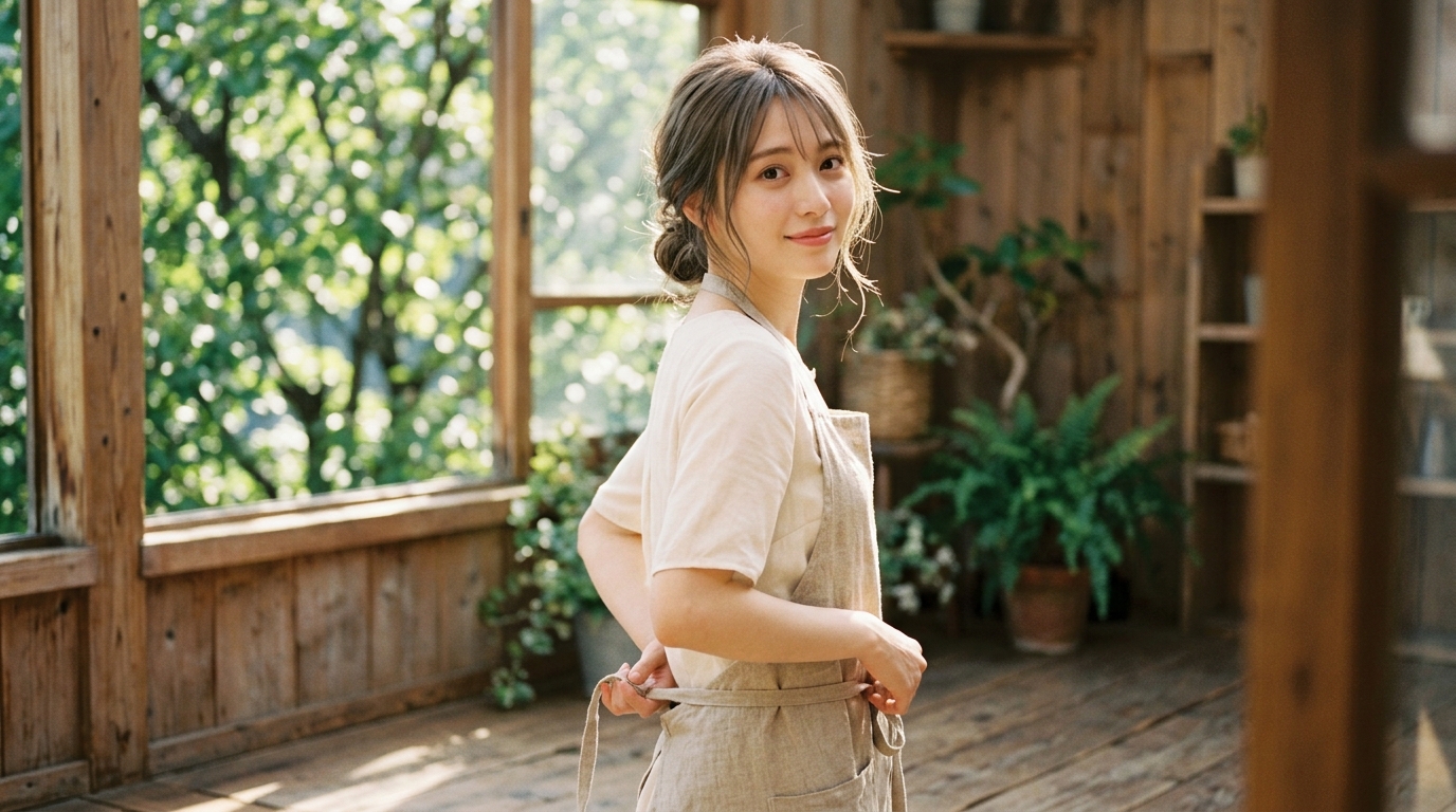 白いリネンエプロンを着て、 風が通る木造の部屋で、しゃがんで夏野菜を選んでいる。 ハイアングルで優しい雰囲気の構図、バストアップ寄り。 木漏れ日の揺れる光が頬に落ち、 生活感と可愛らしさが同時に伝わる、自然体の写真集シーン。