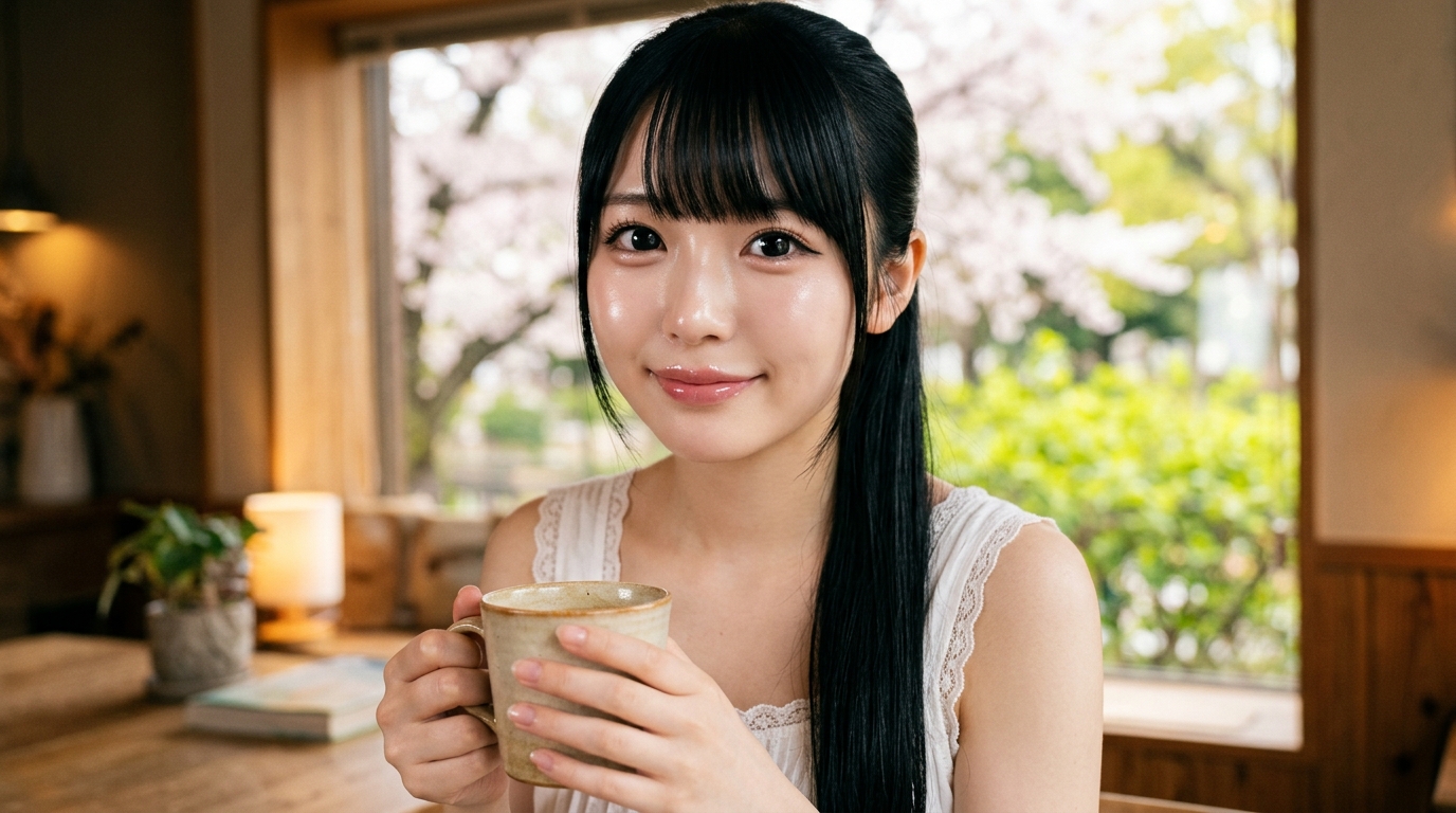 20-year-old Japanese spring healing girlfriend beauty, 158cm height, relaxing at a cozy cafe with a warm drink, sweet loving smile, big sparkling eyes with thick eyeliner, prominent aegyo-sal, idol makeup, fair porcelain skin, ultra glossy luminous texture, dewy radiant finish, plump glossy pink lips, wet shine, full moist lips with clear gloss, long straight black hair, sleek ponytail, straight full bangs, jet black hair, white flowy sundress with lace, breezy spring style, slightly shy playful cheerful expression, looking up at camera, direct eye contact close-up, intimate girlfriend portrait, cherry blossom park, soft diffused daylight, warm morning light, looking up at camera, intimate girlfriend gaze, looking at viewer lovingly, slightly shy expression, healing aura, ultra detailed, 8k, photorealistic, masterpiece, best quality, sharp focus, professional photography, beautiful Japanese woman, attractive height 152-163cm, slender feminine physique, soft natural curves, cute spring girlfriend figure, idol-like facial features, big sparkling eyes, prominent aegyo-sal, defined eyeliner, full polished makeup, fair youthful skin, ultra glossy luminous texture, glossy moist hydrated lips, youthful 20-year-old appearance, cute proud girlfriend beauty, feminine soft body with attractive figure, looking up at camera, intimate girlfriend gaze, looking at viewer lovingly, slightly shy expression, healing aura, vibrant spring energy, cinematic spring lighting, one person only, gap moe aesthetic, beautiful spring contradictionNegative prompt: bad anatomy, bad hands, extra fingers, ugly, poorly drawn face, deformed, blurry, lowres, worst quality, duplicate, watermark, old, mature, wrinkles, aged appearance, asymmetrical face, extra limbs, multiple people, crowd, group, other person in frame, overly muscular body, masculine shoulders, thick neck, athletic muscular physique, fitness model body, narrow shoulders, thin neck, delicate frame, petite build under 152cm, small eyes, no aegyo-sal, minimal makeup, natural no-makeup look, dark skin, tanned skin, sun-damaged skin, uneven skin tone, dry lips, chapped lips, matte lips, thin lips, cartoon, anime style, illustration, painting, drawing, CGI, 3D render, digital art, plastic skin, artificial, winter clothing, heavy coats, non-spring outfits, messy appearance, unkempt, unprofessional setting, no looking up at camera, looking away from viewer, cold lighting, winter environment
