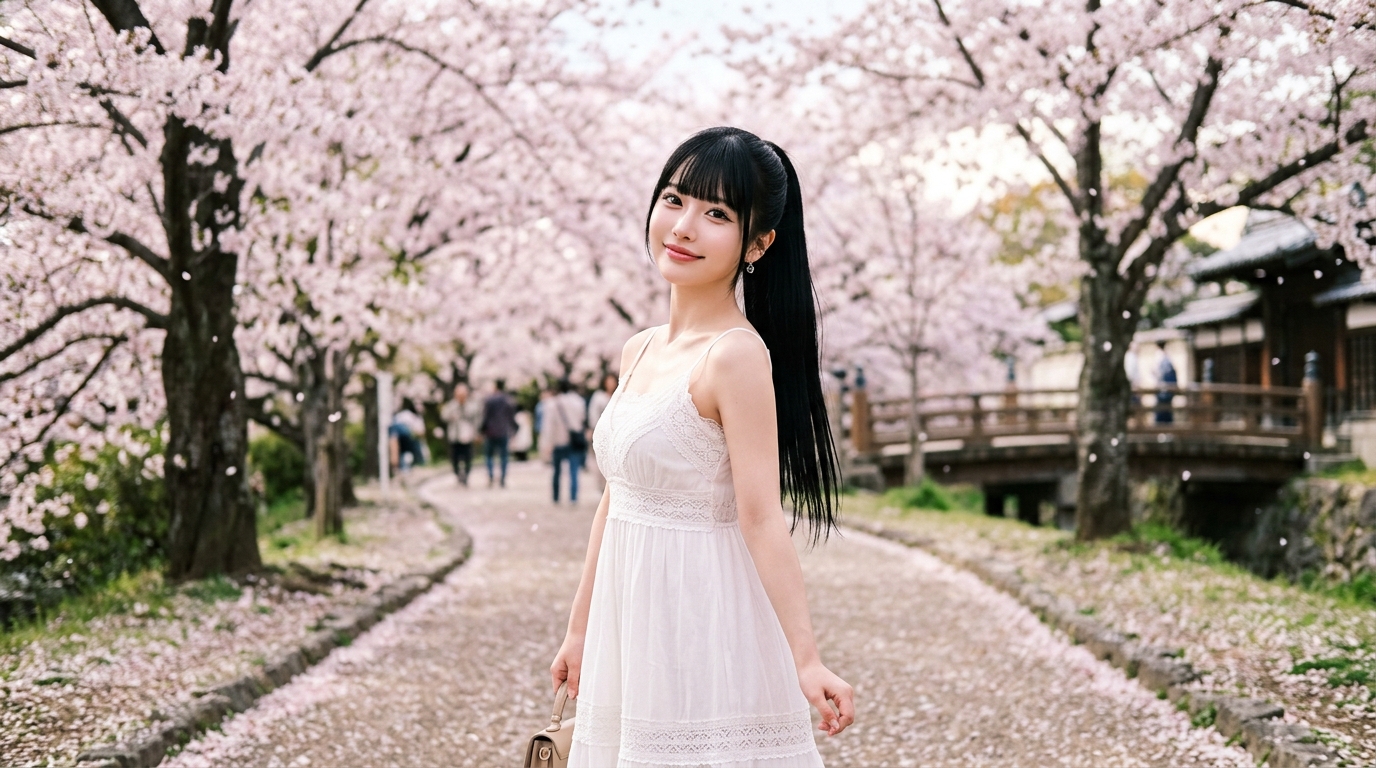 20-year-old Japanese spring healing girlfriend beauty, 158cm height, strolling in a cherry blossom park, sweet loving smile, big sparkling eyes with thick eyeliner, prominent aegyo-sal, full polished makeup, fair porcelain skin, ultra glossy luminous texture, dewy radiant finish, plump glossy pink lips, wet shine, long straight black hair, sleek ponytail, straight full bangs, jet black hair, white flowy sundress with lace, sweet loving smile, direct intimate gaze to camera, slightly shy, direct eye contact close-up, looking up, cherry blossom park, soft diffused daylight, looking up at camera, intimate girlfriend gaze, looking at viewer lovingly, slightly shy expression, healing aura, ultra detailed, 8k, photorealistic, masterpiece, best quality, sharp focus, professional photography, beautiful Japanese woman, attractive height 152-163cm, slender feminine physique, soft natural curves, cute spring girlfriend figure, idol-like facial features, big sparkling eyes, prominent aegyo-sal, defined eyeliner, full polished makeup, fair youthful skin, ultra glossy luminous texture, glossy moist hydrated lips, youthful 20-year-old appearance, cute proud girlfriend beauty, feminine soft body with attractive figure, looking up at camera, intimate girlfriend gaze, looking at viewer lovingly, slightly shy expression, healing aura, vibrant spring energy, cinematic spring lighting, one person only, gap moe aesthetic, beautiful spring contradictionNegative prompt: bad anatomy, bad hands, extra fingers, ugly, poorly drawn face, deformed, blurry, lowres, worst quality, duplicate, watermark, old, mature, wrinkles, aged appearance, asymmetrical face, extra limbs, multiple people, crowd, group, other person in frame, overly muscular body, masculine shoulders, thick neck, athletic muscular physique, fitness model body, narrow shoulders, thin neck, delicate frame, petite build under 152cm, small eyes, no aegyo-sal, minimal makeup, natural no-makeup look, dark skin, tanned skin, sun-damaged skin, uneven skin tone, dry lips, chapped lips, matte lips, thin lips, cartoon, anime style, illustration, painting, drawing, CGI, 3D render, digital art, plastic skin, artificial, winter clothing, heavy coats, non-spring outfits, messy appearance, unkempt, unprofessional setting, no looking up at camera, looking away from viewer, cold lighting, winter environment