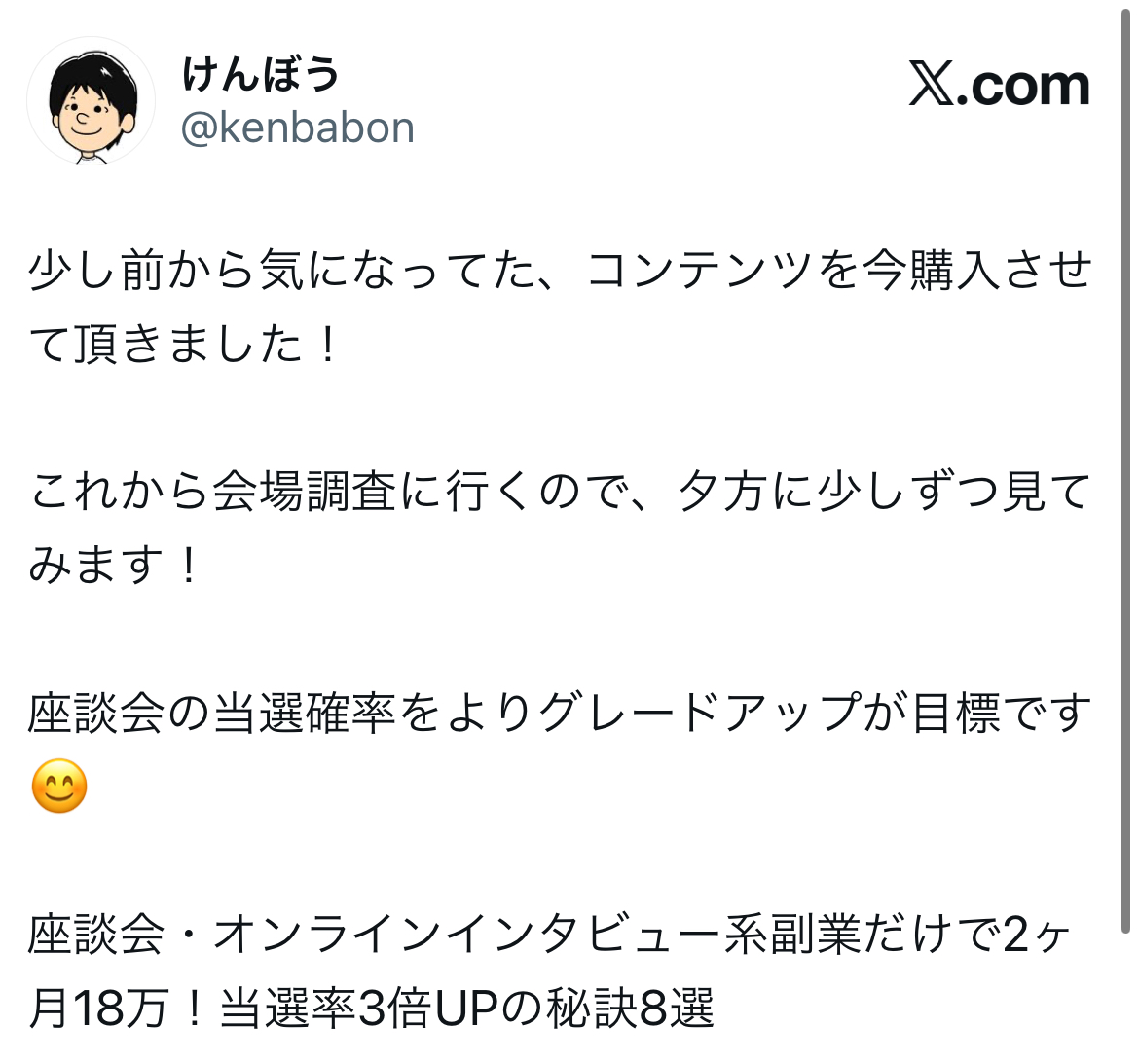 - インタビュー・座談会系の副業ですぐ収益化できました。