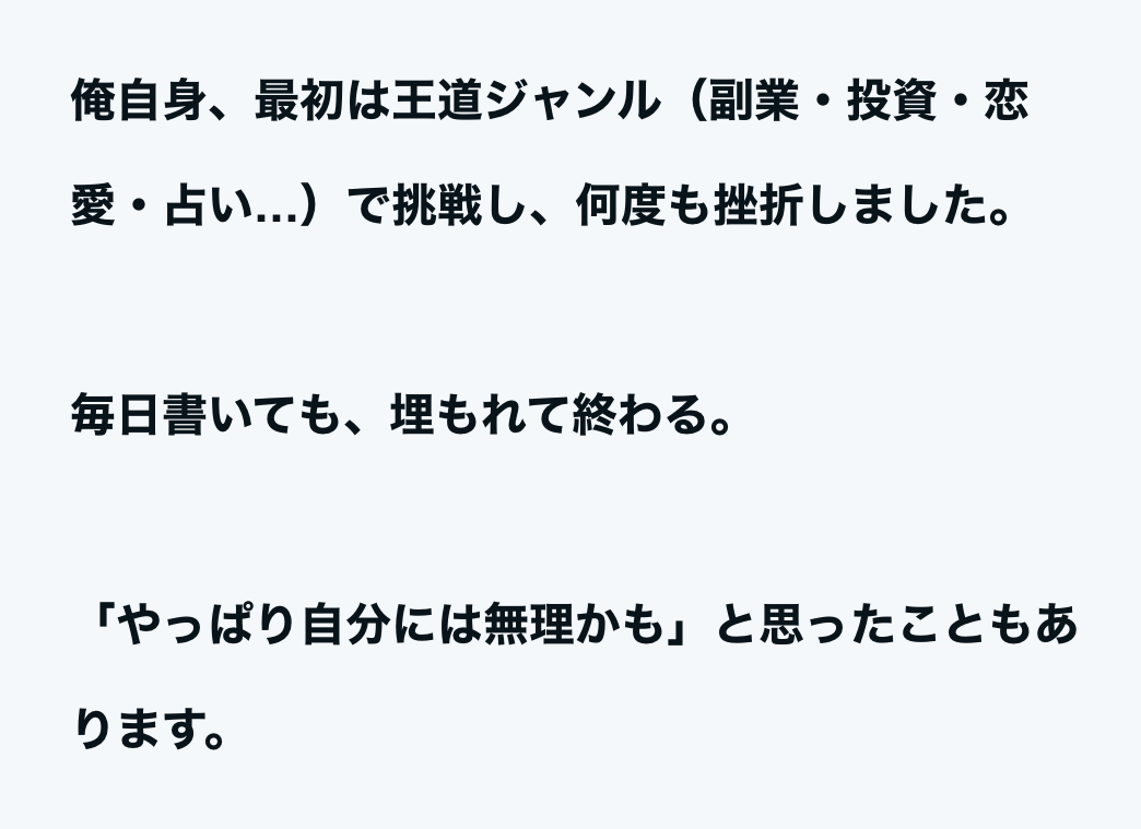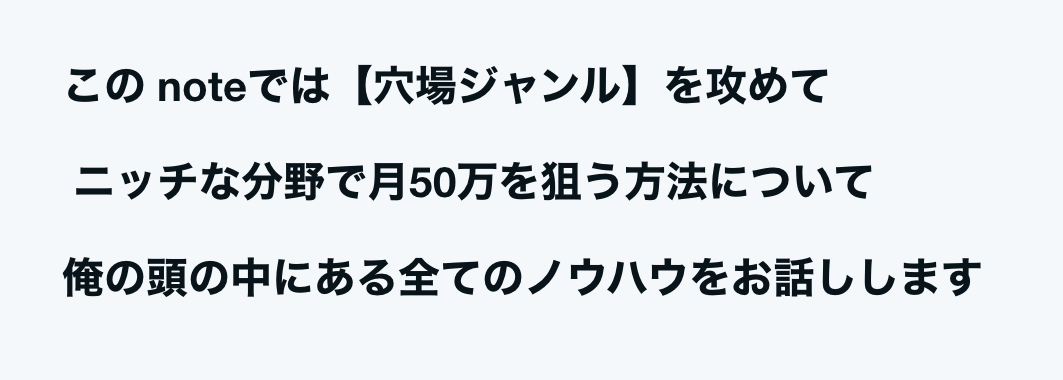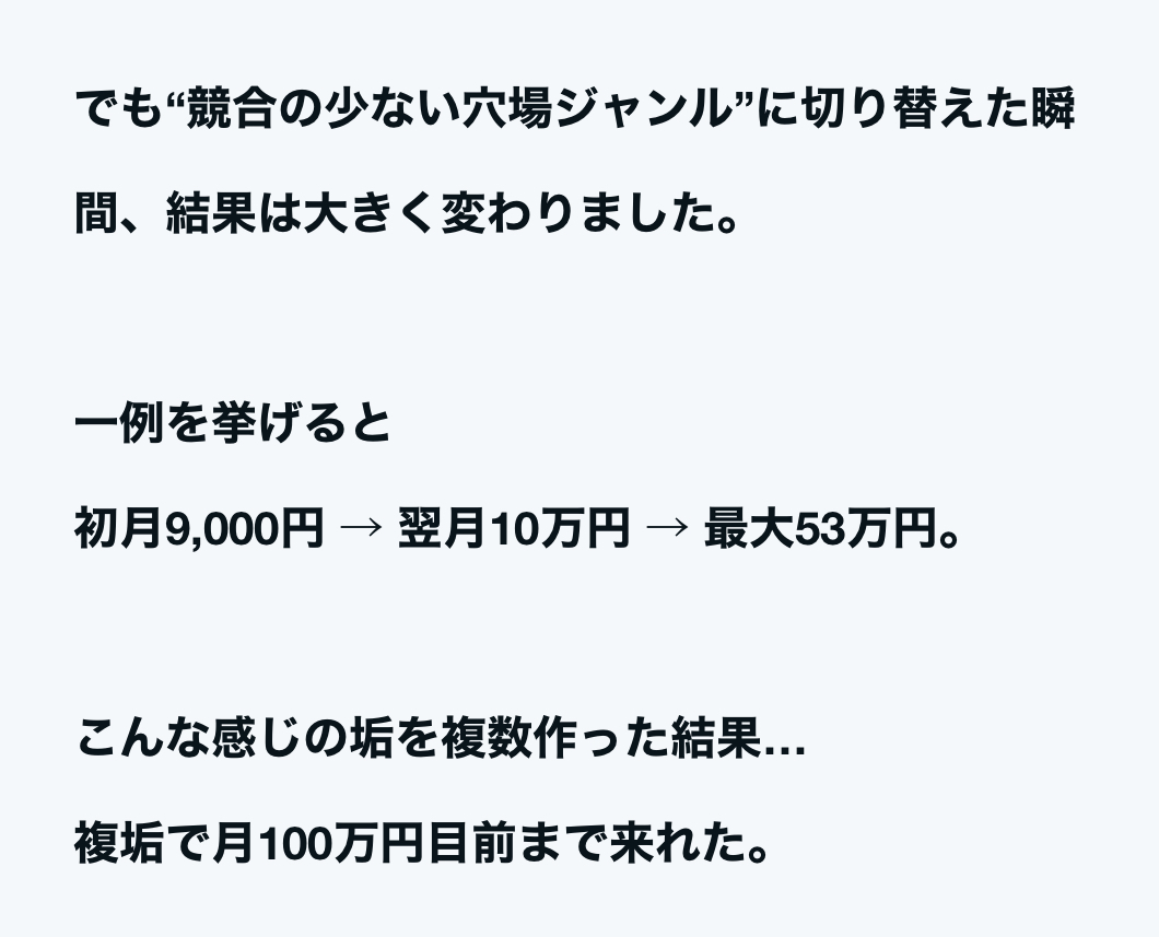 - 王道ジャンル(投資・恋愛・ダイエット等)には参入せず、あえて穴場ジャンルで収益化