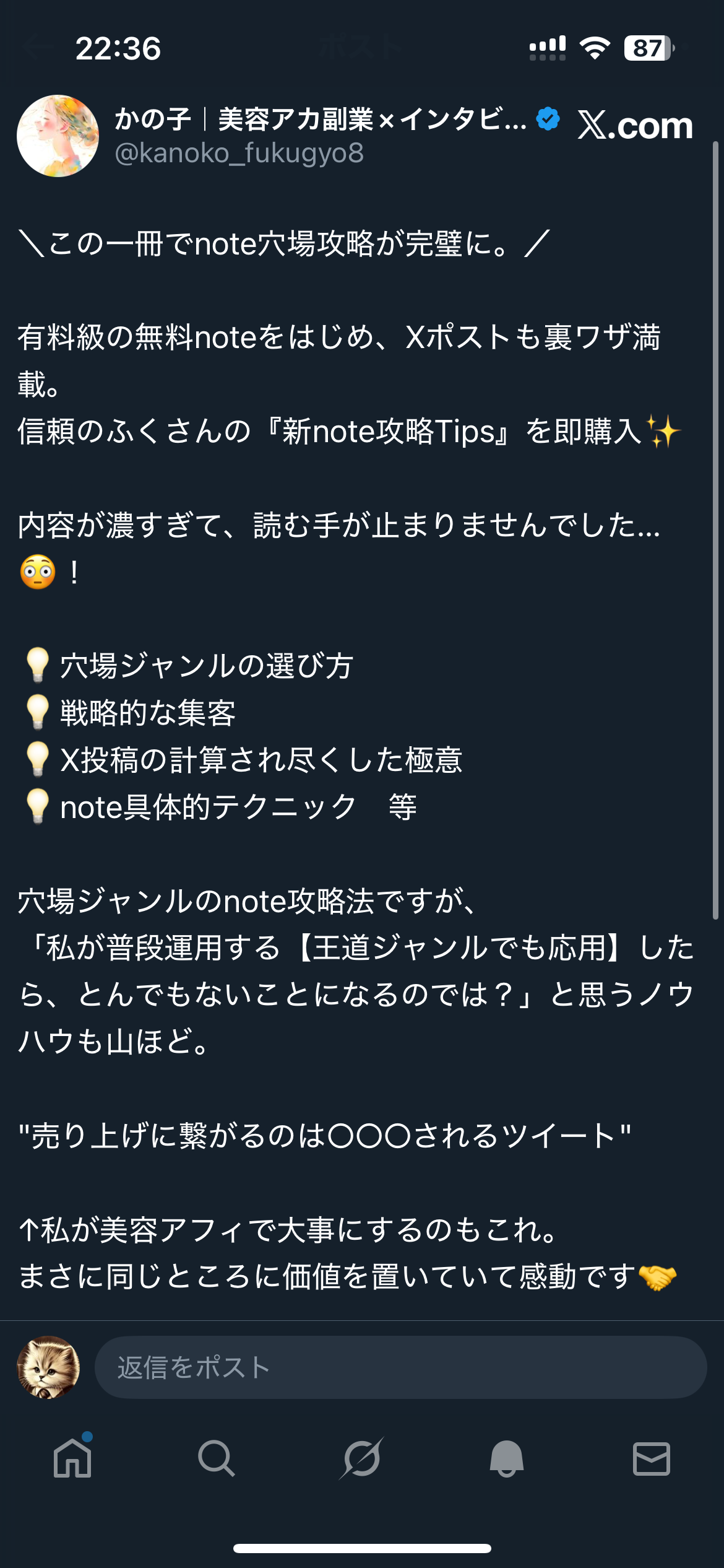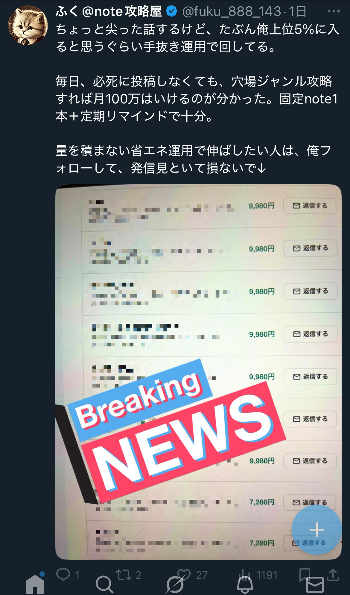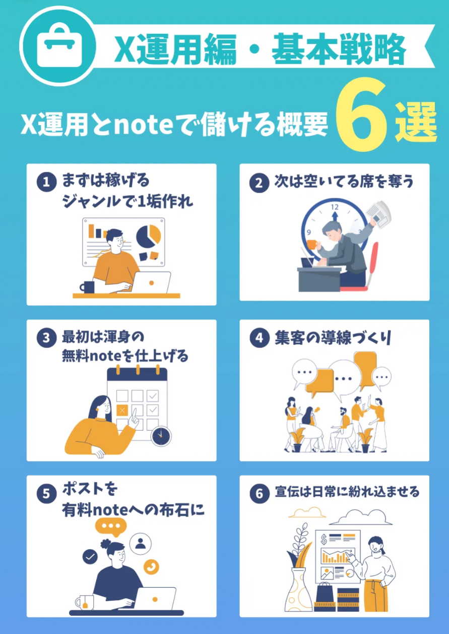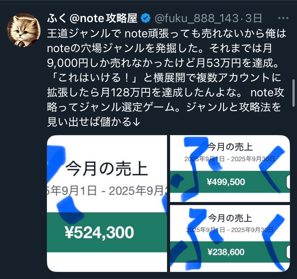 俺は“noteでどうやって稼ぐか”に特化して研究し、稼ぎやすい戦略や仕組みづくりをX(旧Twitter)で発信しています。