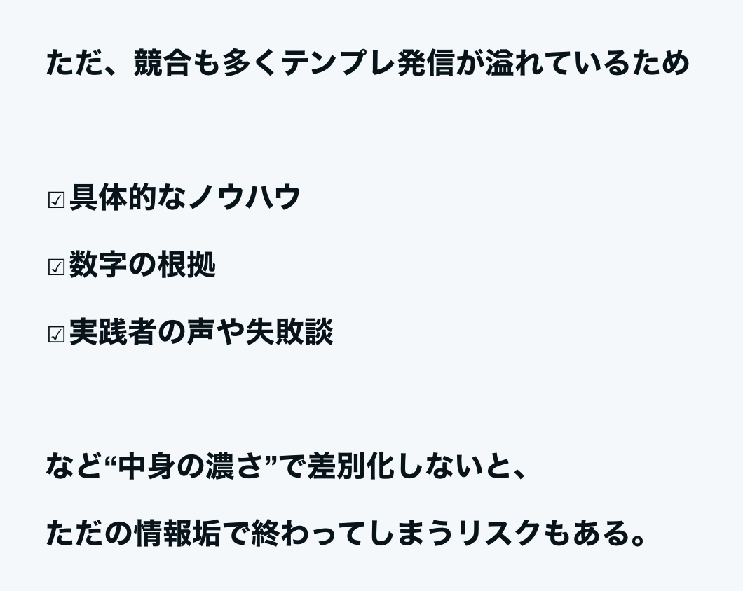 - 差別化は“具体性と数字”で