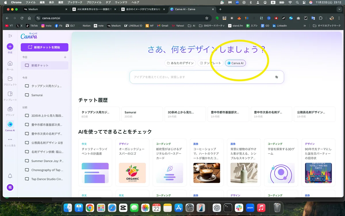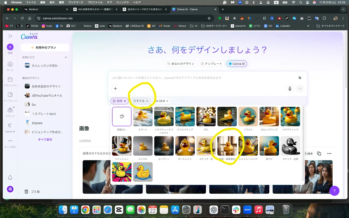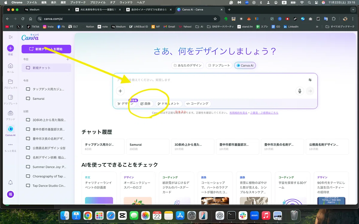 プロンプト入力ボックスが現れるのでそこをクリックすると、デザイン 画像 ドキュメント コーディングの選択肢が現れるので、画像を選択します。