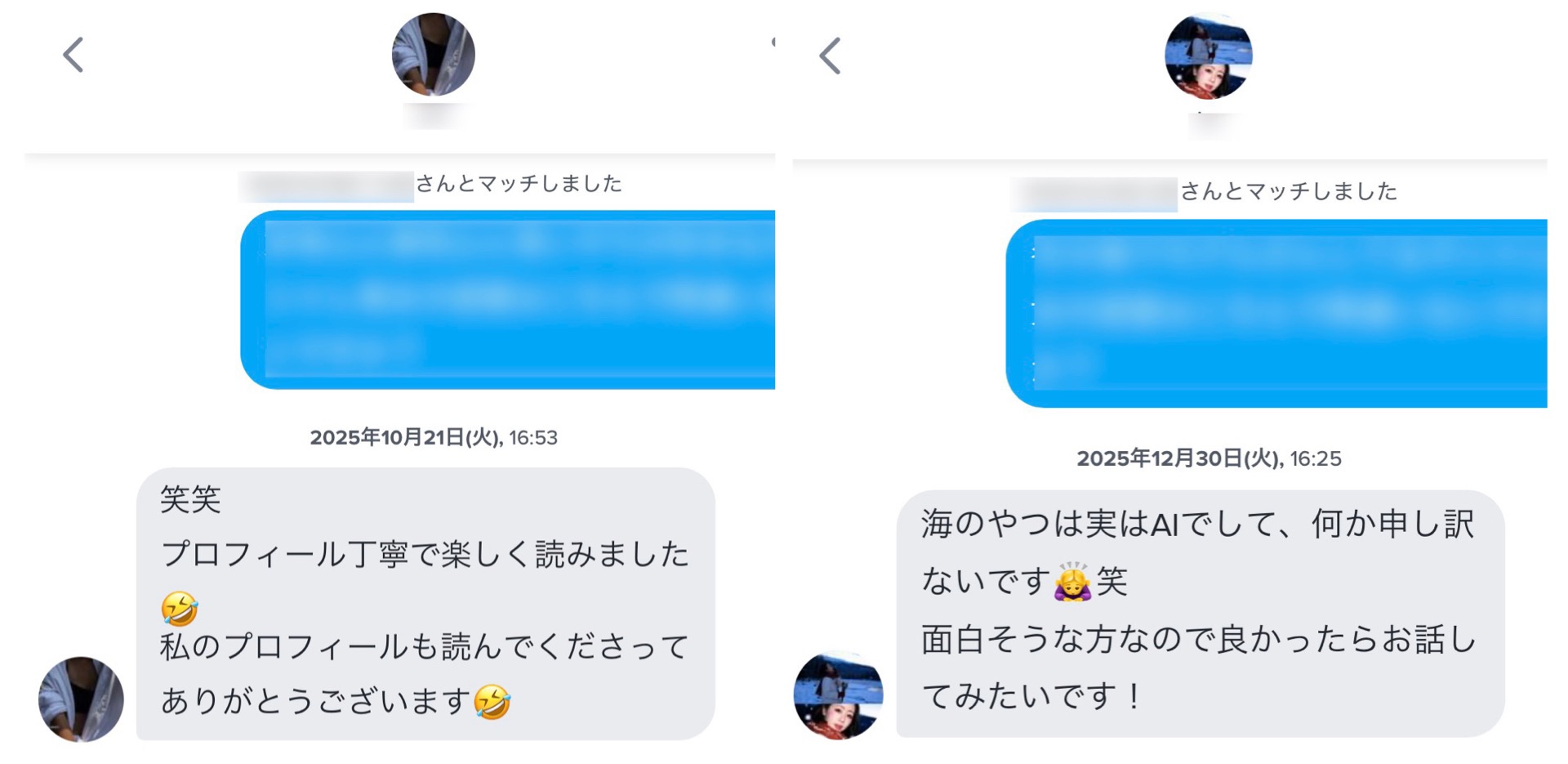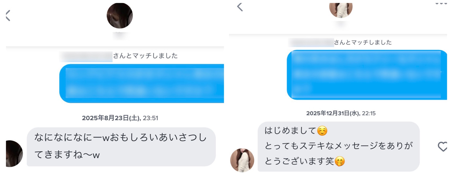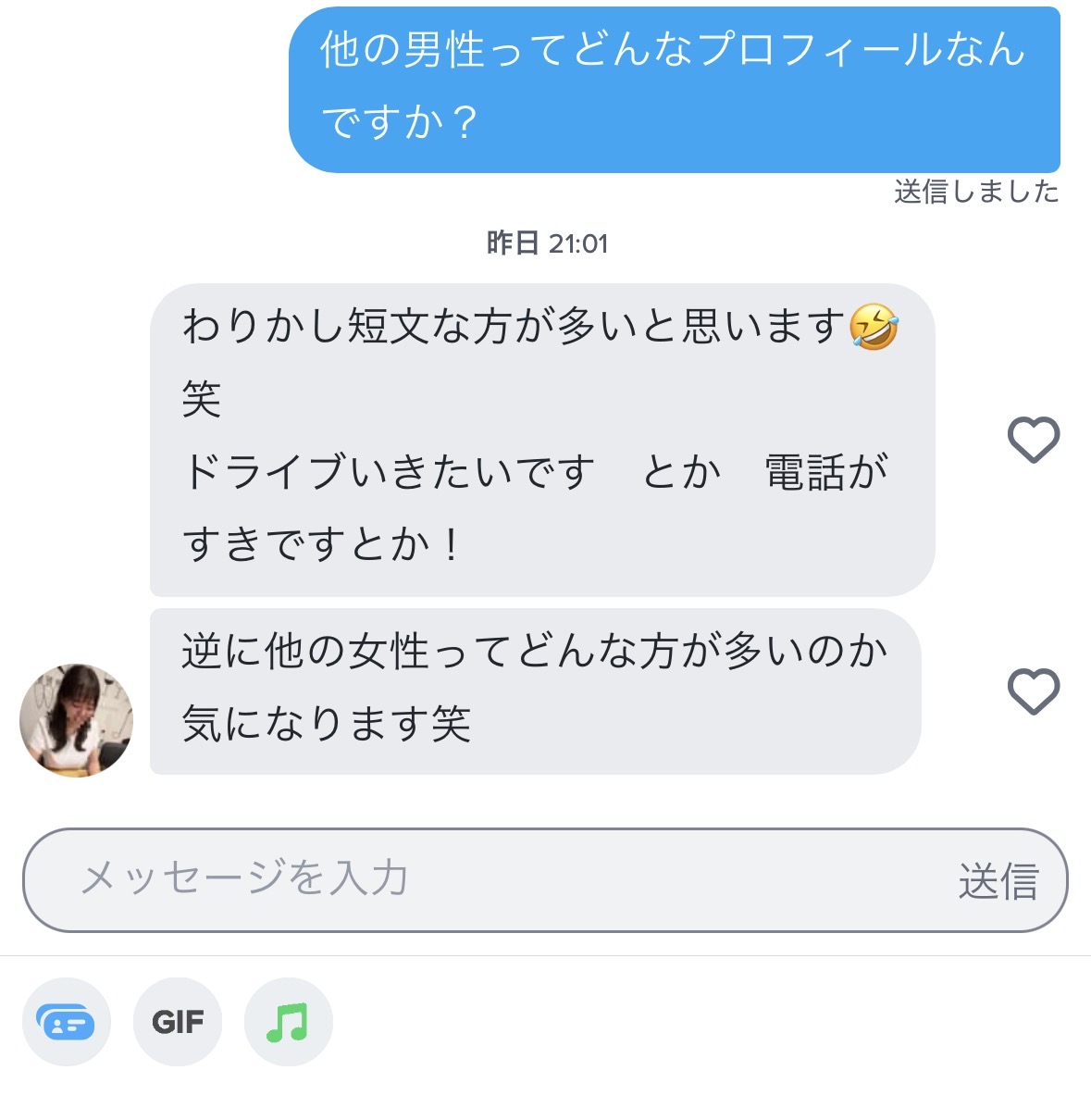 マッチ後に送る最初のメッセージも「初めまして」や「マッチありがとうございます」なんてありきたりなものではなく、ほんの少しのユーモアでこんなふうに返ってきます↓
