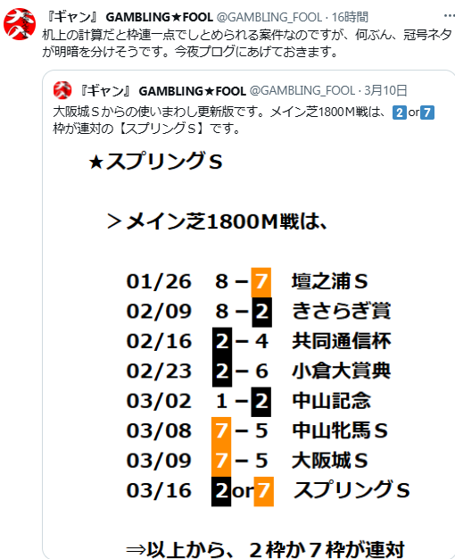 現在、笠倉出版社「競馬大予言」に執筆中。 当 日平場レースの連対枠から特別レースへの枠連動を導く競馬出目作戦🧐