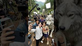 背景には、プロ仕様の撮影機材、撮影に使われた山奥、シシ神、両側にスタジオ照明、配置されており、本物の映画撮影現場(オン・セット)のような熱気ある雰囲気を演出してください。