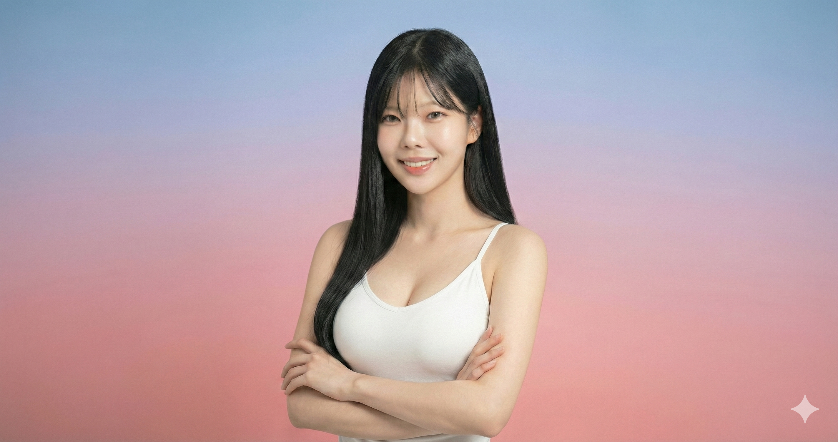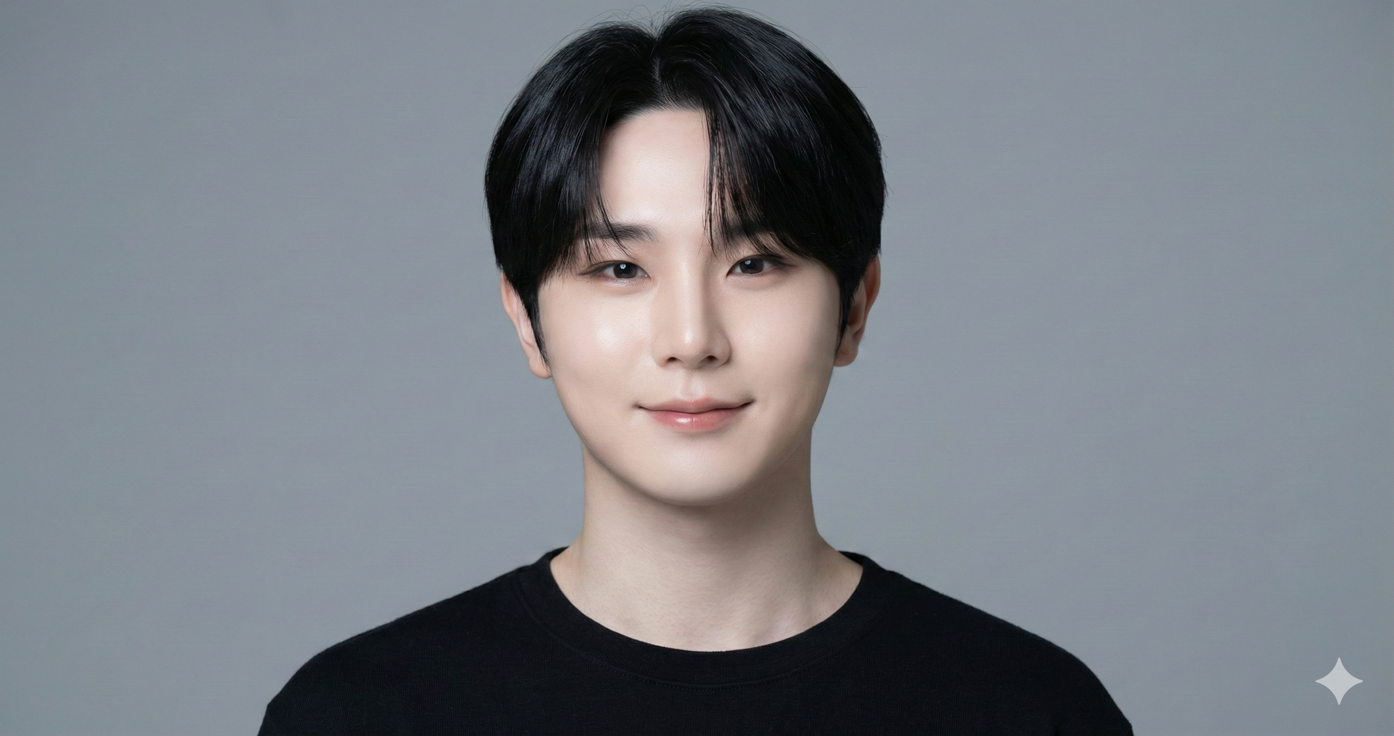 清楚でナチュラルな雰囲気の韓国アイドル風の男性。透き通るような白い肌で、自然な黒髪のストレートヘアはセンター分けの長さ。ふんわりとした前髪。やわらかく微笑んだ表情で、肌は艶やか。シンプルな黒い無地の服を着て、背景はグレーのスタジオ風。自然光ライティングで、落ち着いた雰囲気のポートレート