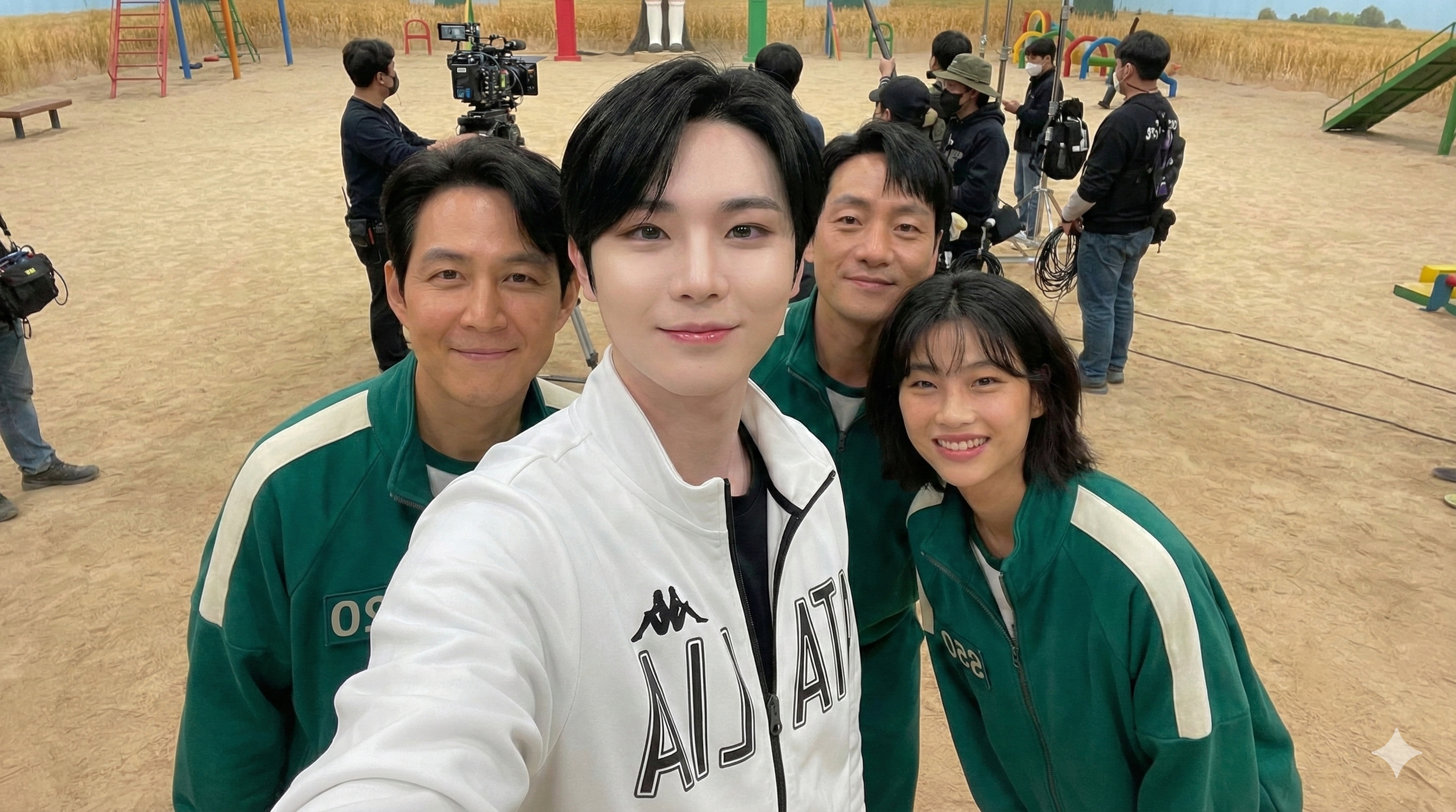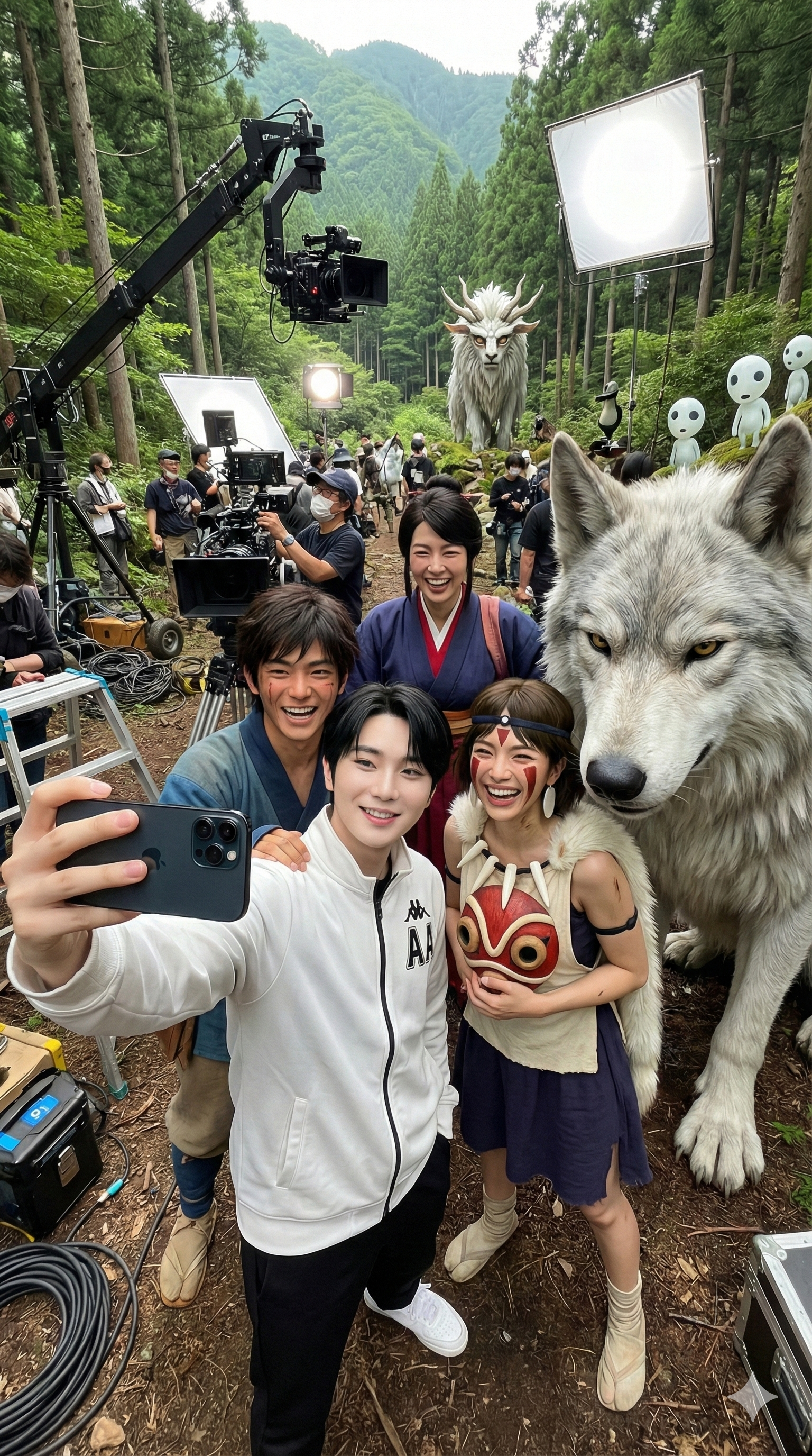 画像の男性が、映画の撮影現場で主人公たちと一緒に仲良くセルフィー(自撮り)を撮っているような写真を作成したいです。