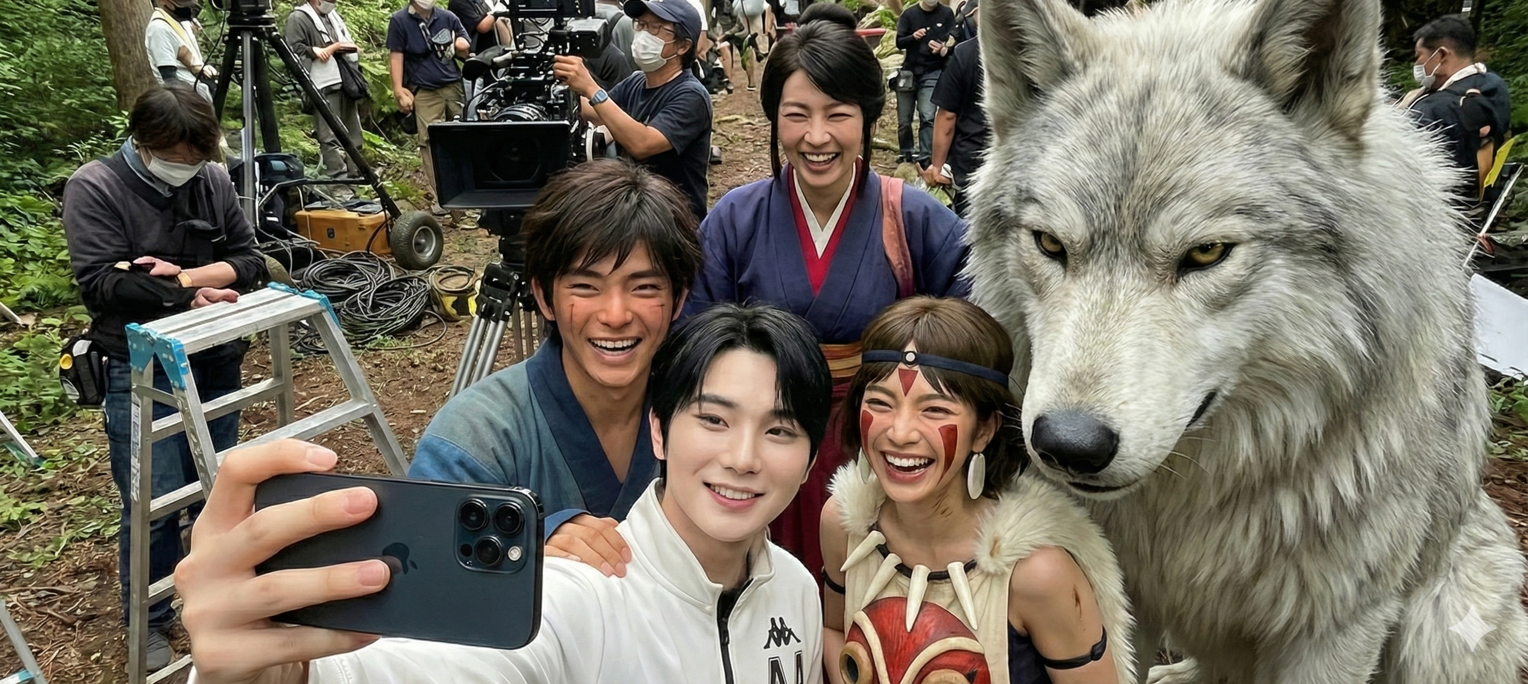 背景は『もののけ姫』の野外撮影現場という設定で、実際の撮影風景のようにリアルに見せてください。