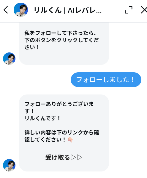 - 自動DM: フォローした瞬間に、感謝のメッセージと「限定プレゼント」を自動送信。