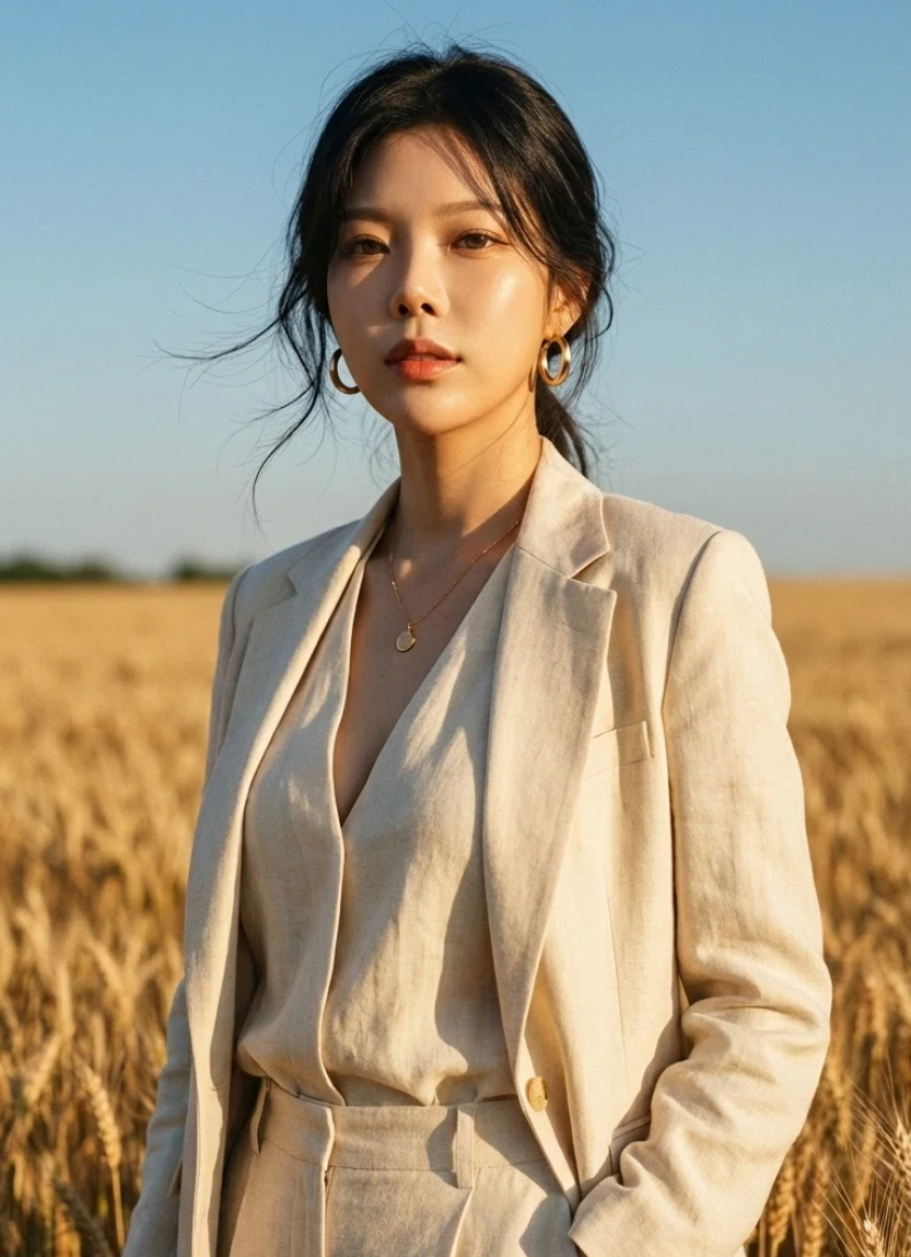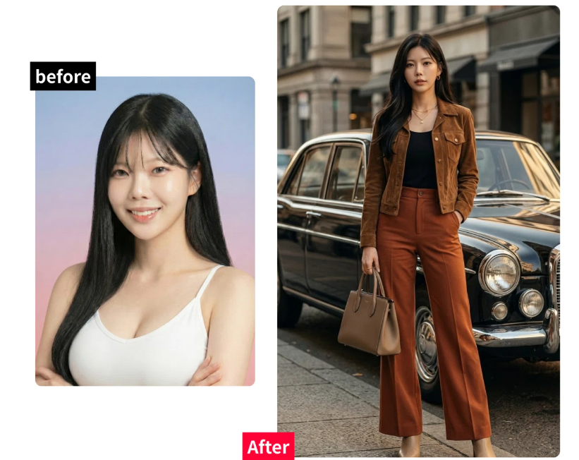 提供されたポートレート画像を主な参照として使用し、参照と同一のスタイルでフォトリアルなシネマティック・ストリートファッションポートレートとして再現してください。Subject(被写体)洗練されたヘアスタイルの自信に満ちた人物。ブラウンのスエードジャケットをブラックのトップスの上に羽織り、ハイウエストのラストカラー(赤茶系)ワイドパンツとベージュのアンクルブーツを合わせている。手には構築的なトープカラーのレザーハンドバッグを持っている。Details(ディテール)スエード、コットン、レザーといった素材感がリアルに表現され、衣服のシワや陰影が自然に見える。さりげないゴールドアクセサリー。ソフトな陰影を活かしたナチュラルメイクで、マット寄りの仕上がり。Environment / Background(環境・背景)クロームディテールが映えるヴィンテージの黒い車が都市の路上に停車している。質感のある舗道、背景には落ち着いたトーンの建物。全体としてレトロでタイムレスな洗練さを感じさせる空気感。Lighting(ライティング)午後遅めの暖かな自然光。肌や車の表面に柔らかなゴールドのハイライトが入り、自然な影とのバランスでシネマティックなリアリズムを演出。Camera / Composition(カメラ・構図)ややローアングルの全身ポートレート。50mm相当レンズを使用。F2.8〜F4の中程度の被写界深度。被写体と背後の車の両方を強調するセンター構図。Style(スタイル)超リアルなシネマティック・エディトリアルポートレート。暖かみのあるブラウンやブロンズを基調としたアーシーなカラーパレット。控えめなフィルムグレインと8Kクラスの高精細描写。1970年代風のラグジュアリー・ファッションシュートを想起させる雰囲気。Final Purpose(最終目的)クラシックな自動車要素と現代的エディトリアルスタイルを融合させた、シネマティックトーンのハイエンド・ファッションフォトを再現すること。ブランドキャンペーンや雑誌掲載に最適。Negative prompt(ネガティブプロンプト)ウォーターマークなし、文字なし、歪みなし、ブレなし、ノイズなし、低解像度なし、強すぎる照明なし、背景の雑多さなし、過度な彩度なし。