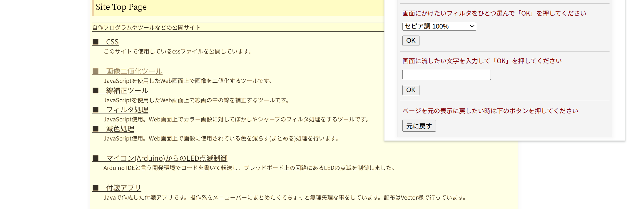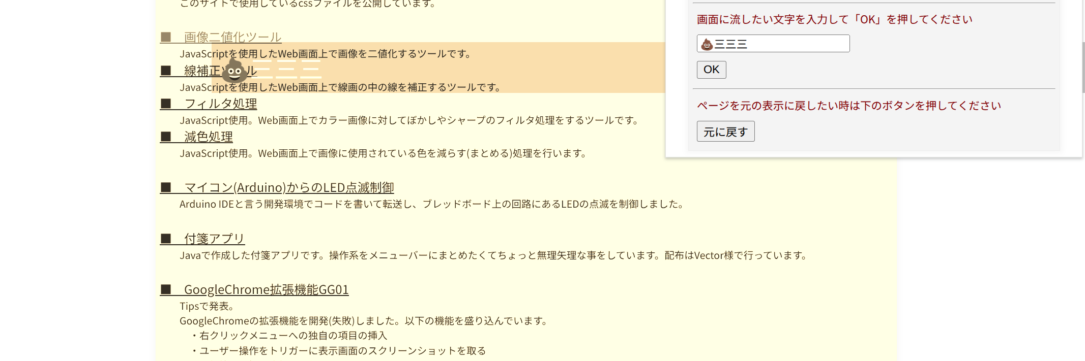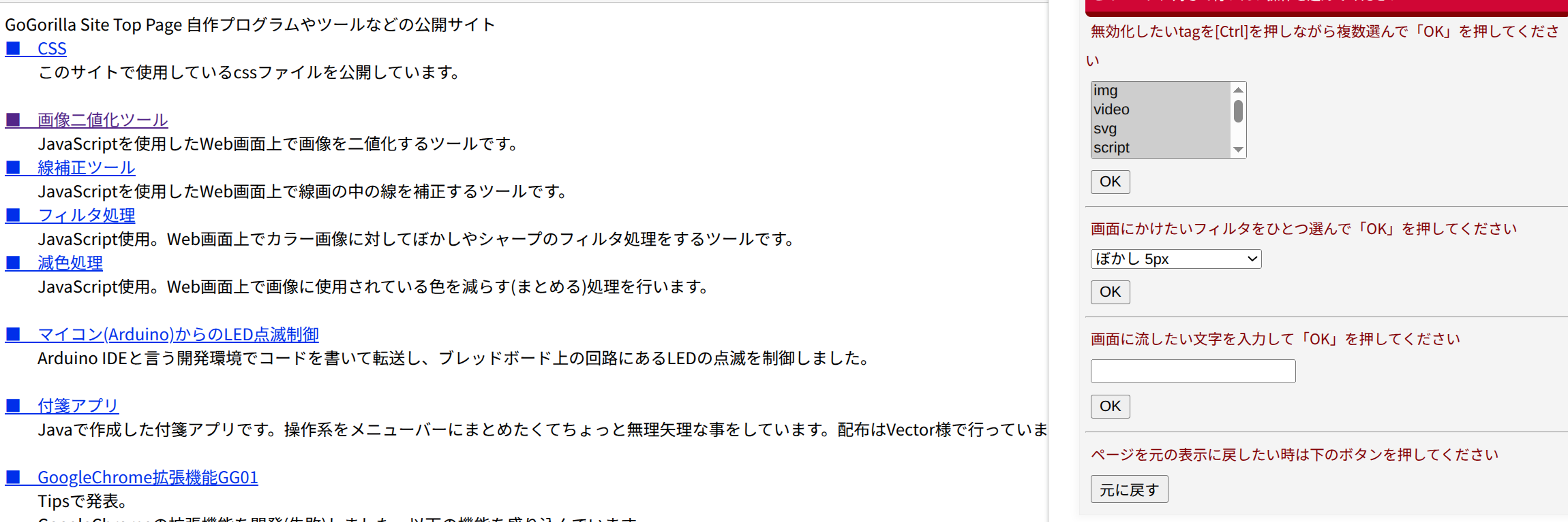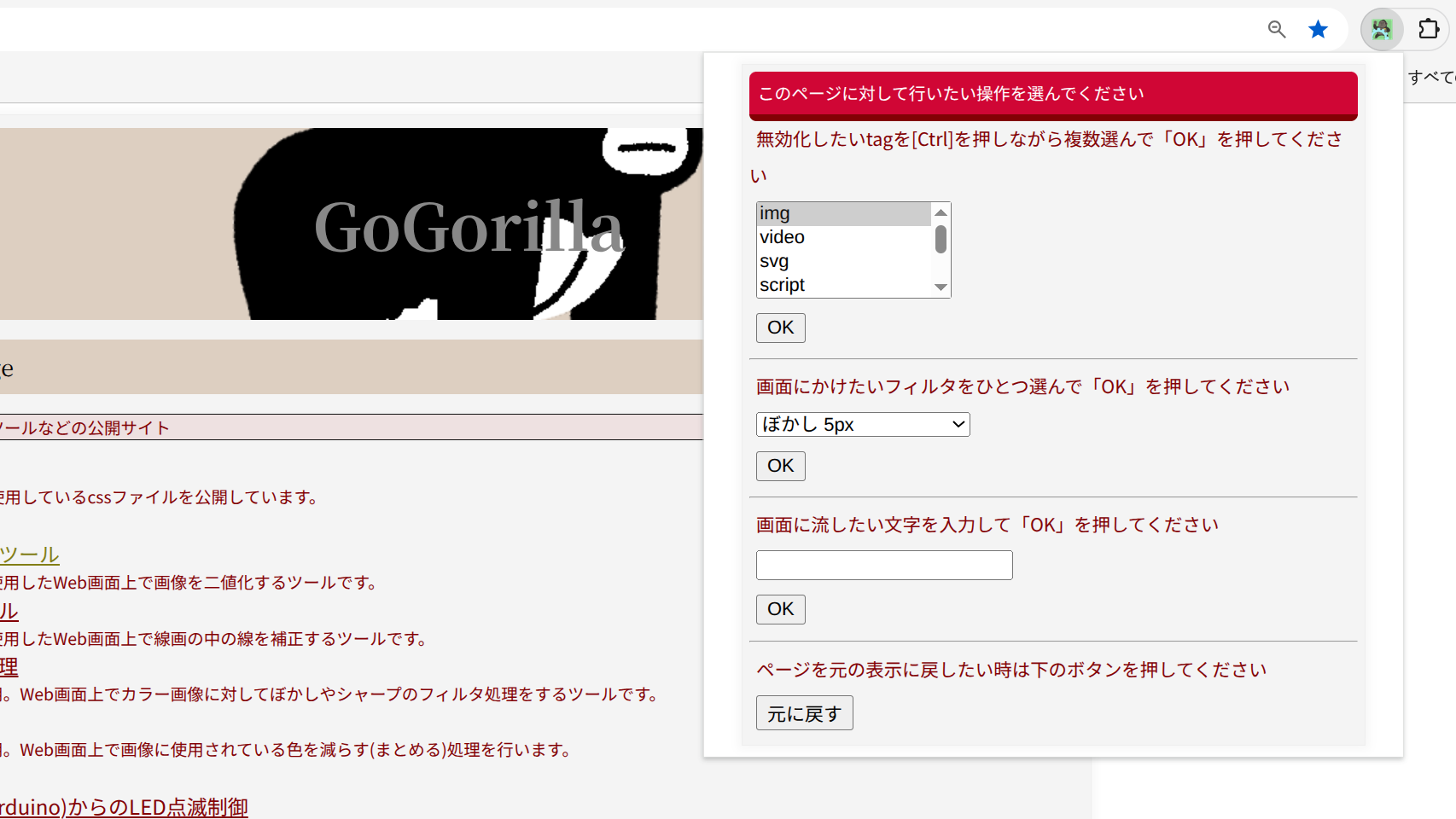 指定した要素を無効化したり、ページ全体にフィルタ処理をかけたり、ポップアップのテキストエリアに入力した文字を画面に流したりという事を行います。