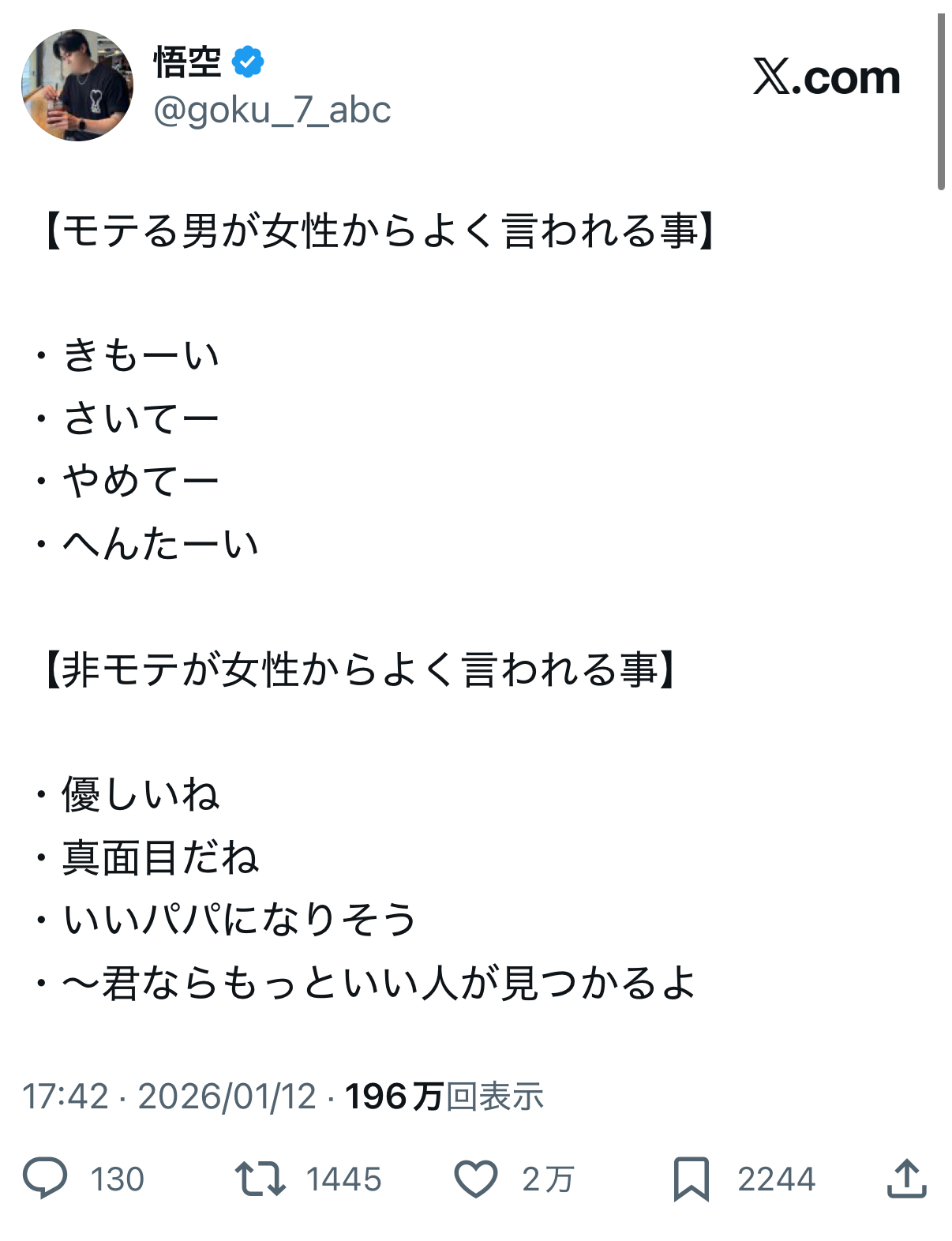 公開日:8時間前 なぜ「きもーい」と言われる男がモテて、「優しいね」しか言われない男が”非モテ”なのか Xでシェア facebookでシェア LINEでシェア 短縮URL 報告する #恋愛 #マッチングアプリ 5ポイント獲得 ¥500 悟空 こんなツイートをしたら、かなりの反響があったので「そのワケ」を解説します。【このTipsでわかること】なぜ「きもーい」と言われる男がモテて、「優しいね」しか言われない男が”非モテ”なのかの理由4つ女性が本能的に惹かれる「good genes」と「good dad」の違い「いい人止まり」「友達止まり」で終わる男と、恋愛対象になる男の差この続きを見るには記事の購入が必要ですこの続きは6,834文字 / 画像16枚 / ファイル0個