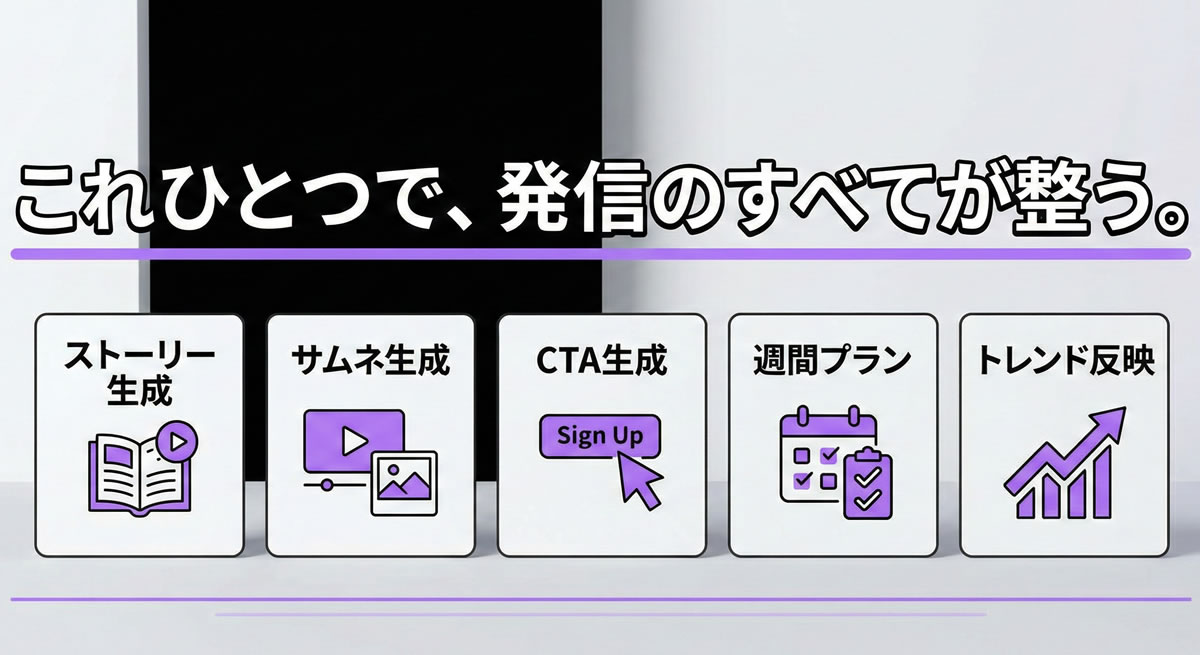 テーマを入れるだけで、5〜10本のストーリー・サムネ文・自然なCTAまで“丸ごと完成形”で届く、あなた専属の発信チームそのものです。動画教材もマニュアルも不要。
