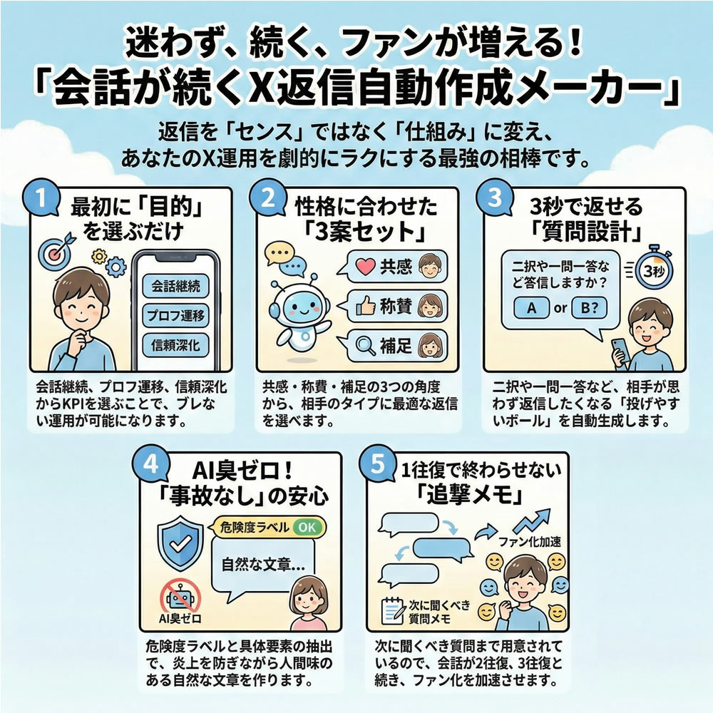 会話が続くX返信を、センスじゃなく「型」で作れるように。優しく寄り添いながら、迷い・事故・気まずさを減らして、自然に関係が積み上がる返信だけを用意します。