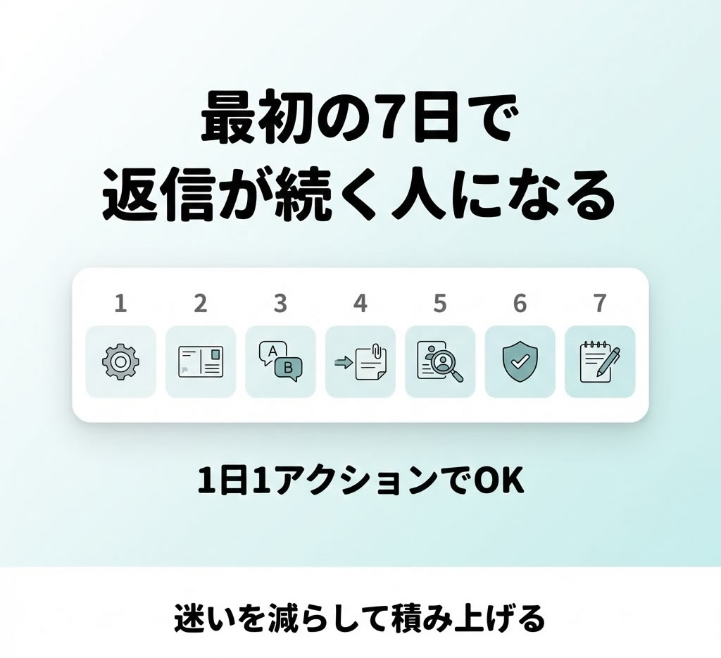 このGPTsは、使い方を理解した瞬間よりも、続けられた瞬間に価値が出ます。だからこそ、最初の7日だけは、迷わない順番を先に決めておくのがおすすめです。いきなり毎日たくさん返信しようとすると、疲れて止まりやすい。返信が下書きで止まってきた人ほど、最初は少なくていいです。大事なのは回数ではなく、迷いが減って貼れる状態になることです。