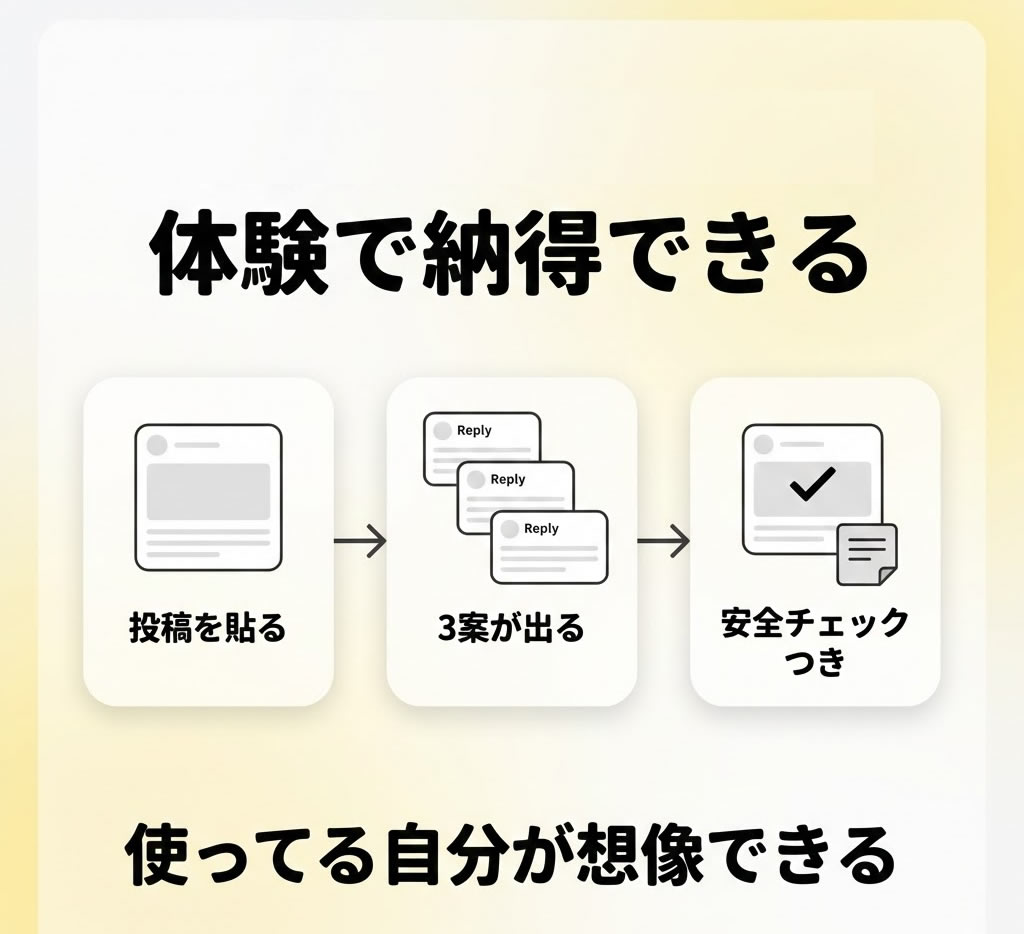 証拠がないと売れないんじゃないか。そう感じるのは自然です。実績のスクショや利用者の声があれば強い。でも、今の段階でそれが揃っていないなら、無理に作ろうとしなくていいと思います。大事なのは、信頼の材料を別の形で用意することです。実績がない状況で一番強いのは、実演です。投稿を貼ったら、どういう考え方で、どういう順番で、どんな返信が出て、どこが安全で、どう会話が続くのか。その流れが目に見えるだけで、読者は納得しやすくなります。
