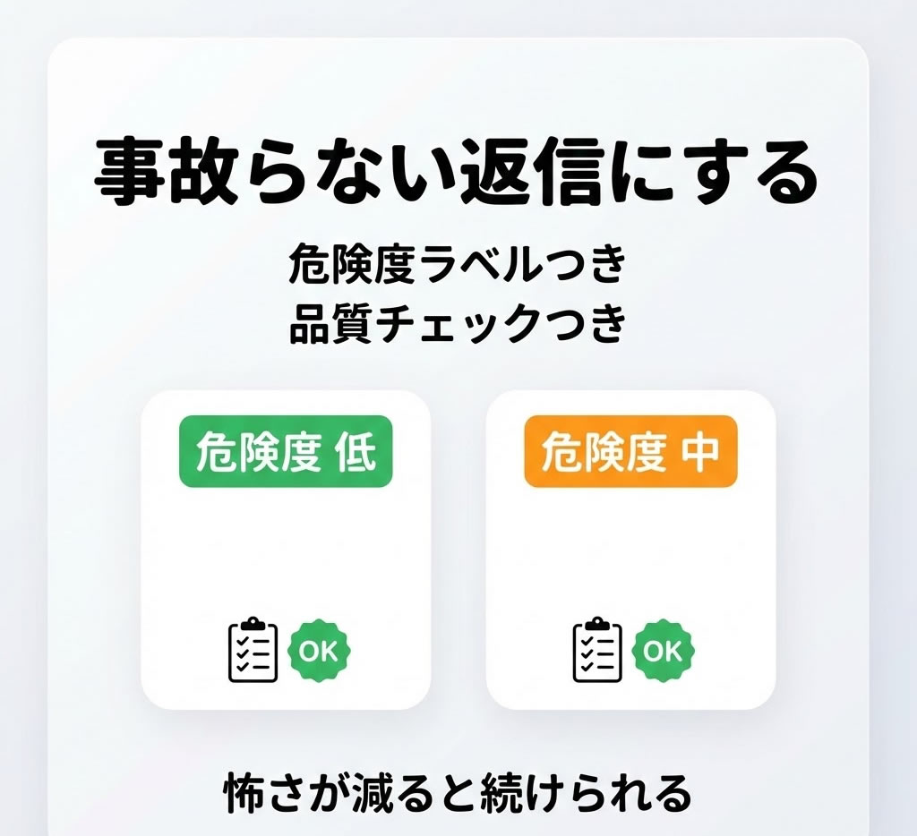 説明炎上・誤解・余計な断定を避けるため、返信案ごとに危険度(低/中/高)と理由を付けます。さらに、具体性・質問・安全・AI臭・KPIなど、最低限の品質チェック観点を同梱します。