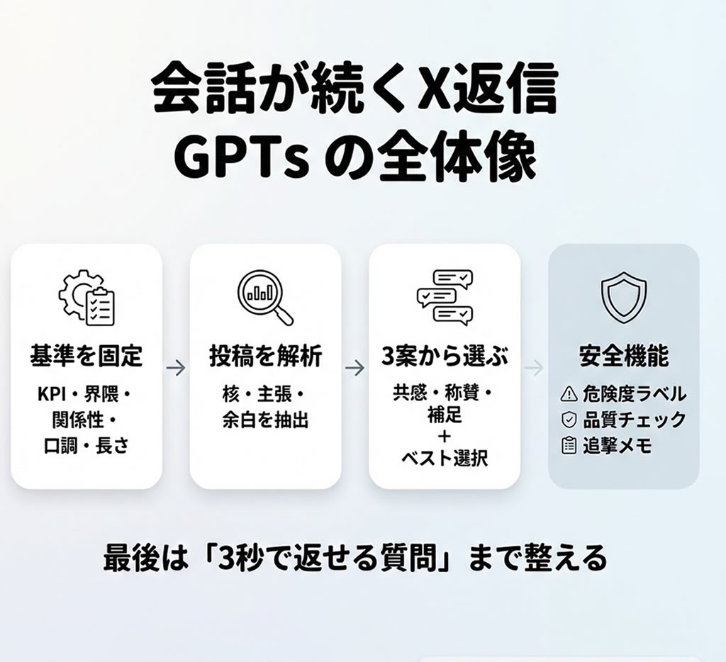 このGPTsは、見せ方がとても作りやすい設計になっています。最初に基準を決める。投稿の核を拾う。3案が出る。狙いが付く。質問が軽く整う。追撃メモがある。危険度とチェックが付く。つまり、読者が欲しいのは完成した返信文だけではなく、安心して使える理由です。ここが可視化されるだけで、証拠がなくても信頼は作れます。