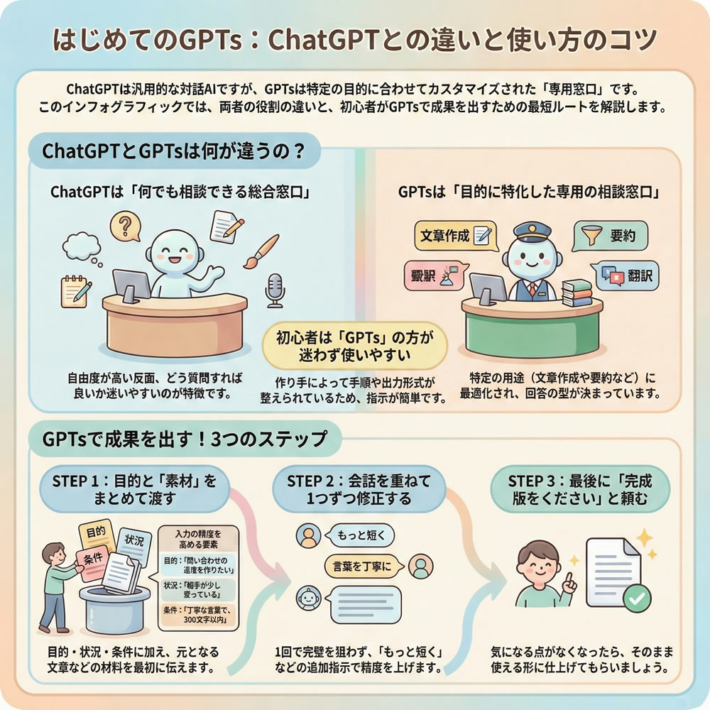 このGPTsがやっているのは、あなたの頑張りを増やすことではなく、迷いを減らすことです。下書きで止まる時間を減らすことです。怖さを減らして、事故を避けることです。そして、返事が返ってきやすい形に整えることです。そうやって、続けられる状態を作ります。続けられると、結果は後から付いてきます。