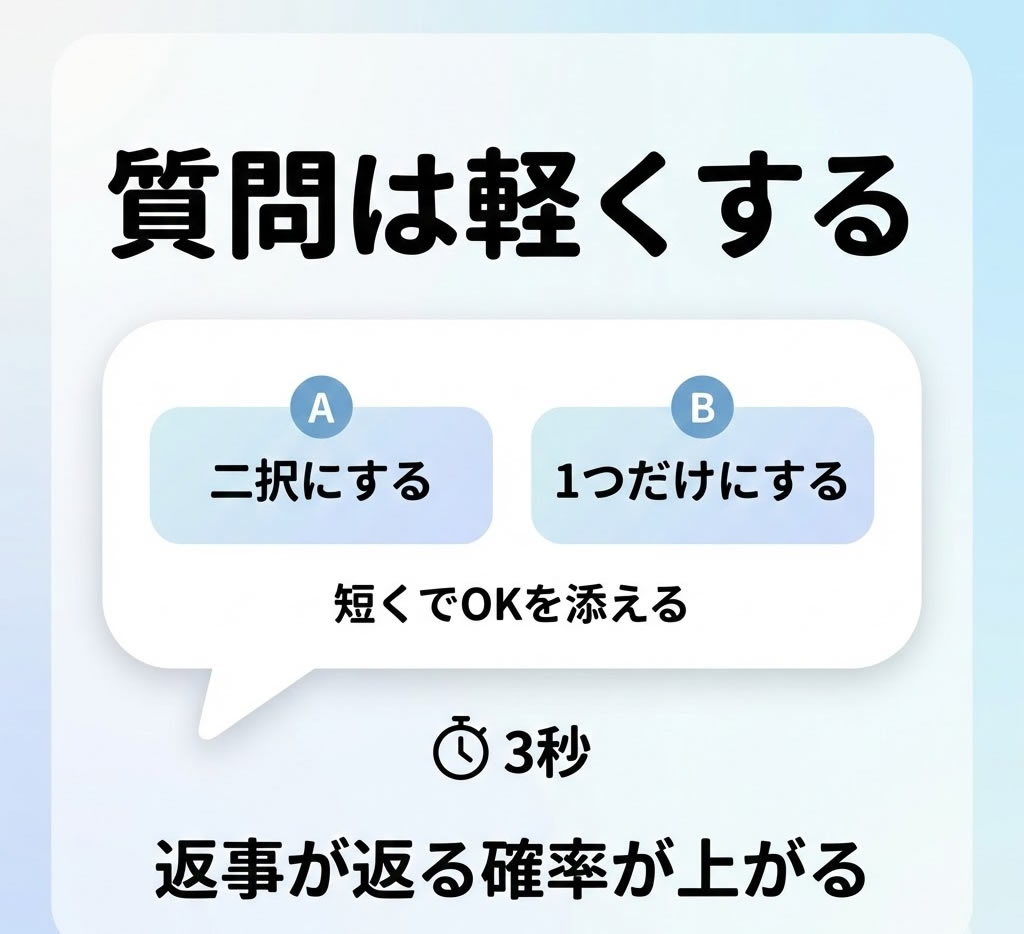 - 相手が多忙でも返しやすい「1つだけ」「A/Bどっち」が強い。