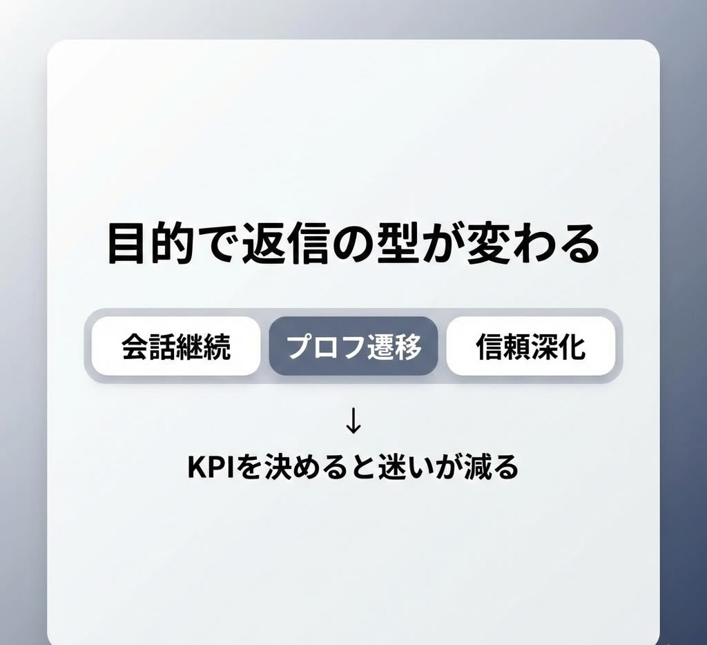 説明各案に「この返信は何のためか(狙い)」を1行で添えます。これにより、返信が“いい感じ”で終わらず、KPIに沿って選びやすくなります(会話継続なのか、プロフ遷移なのか、信頼深化なのか)。