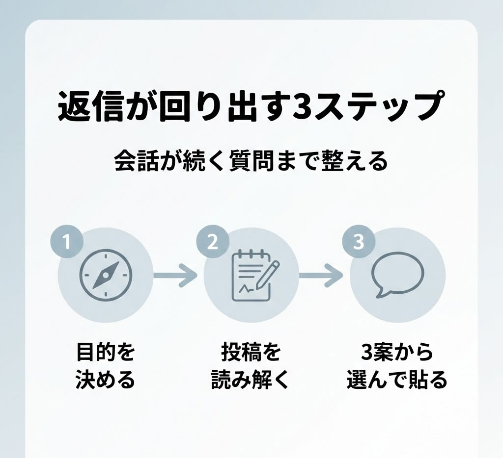同じ投稿でも角度を分けて3案を出すから、空気に合う返信がすぐ選べます
