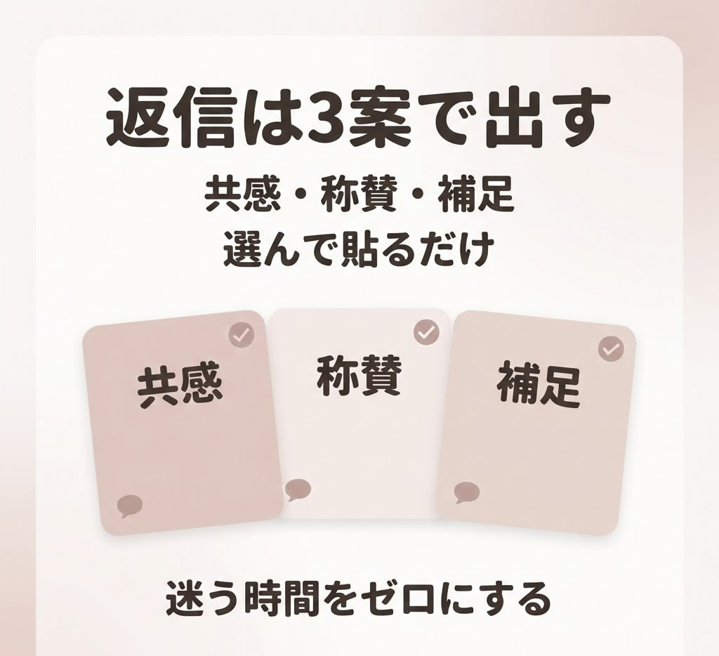 3) 貼るだけで使える「3案セット返信」(共感 / 称賛 / 補足)