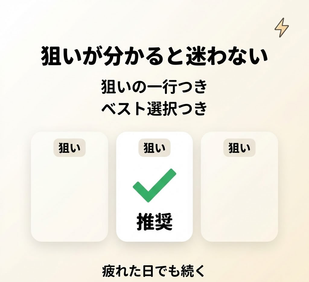 この三つのKPIは、どれが正しいという話ではありません。あなたが今、何を積み上げたいかで選べばいい。会話の回数を増やしたいなら会話継続。興味を持ってもらう入口を作りたいならプロフィール遷移。関係を太くしたいなら信頼深化。目的が決まると、返信はその場の気合いではなく、積み上がる活動になります。次のセクションでは、この積み上げをさらに簡単にするために、各案に付く狙いの一行と、ベスト選択がどう役立つのかを具体的に紹介します。