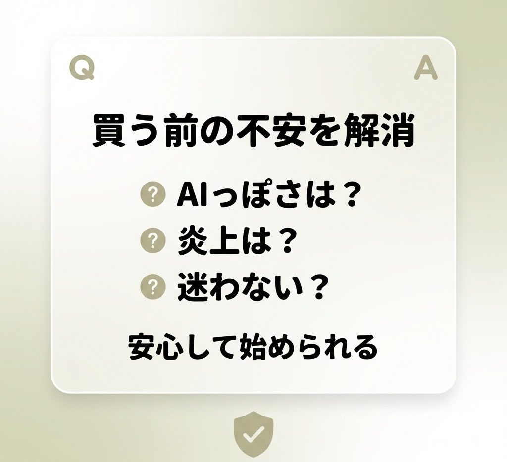 証拠がないから買えない、と感じている人もいるかもしれません。でもこの商品は、実績の自慢で納得させるタイプではなく、体験で納得させるタイプです。投稿を貼る。3案が出る。狙いが見える。質問が軽い。追撃がある。安全チェックがある。その流れを見たときに、できそうと思えるかどうか。そこがいちばん大事です。