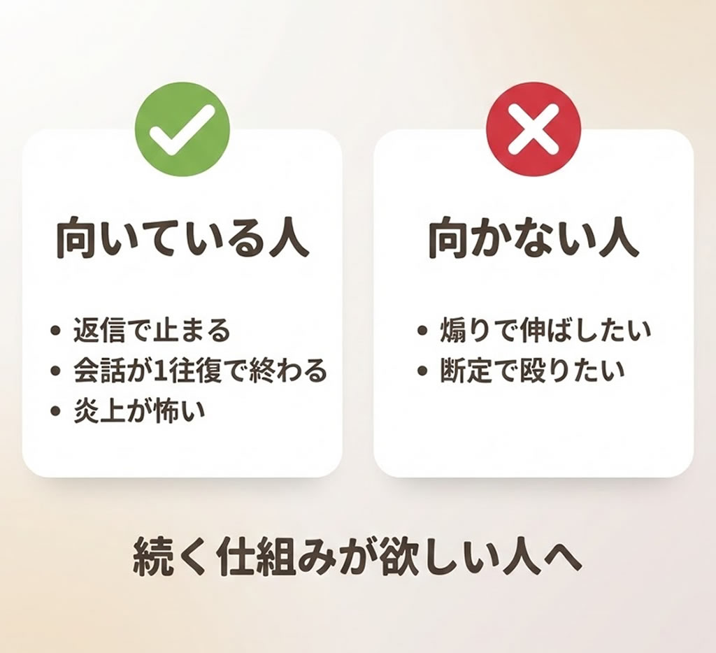 次に、このGPTsが向いている人をはっきりさせます。向いているのは、返信したい気持ちはあるのに、毎回迷って止まる人です。会話が1往復で終わることが多い人です。AIっぽい文章で信用を落としたくない人です。炎上や誤解が怖くて絡めない人です。返信を短時間で終わらせたい人です。フォロワーを増やすというより、信頼や仕事のきっかけに繋がる関係を増やしたい人です。