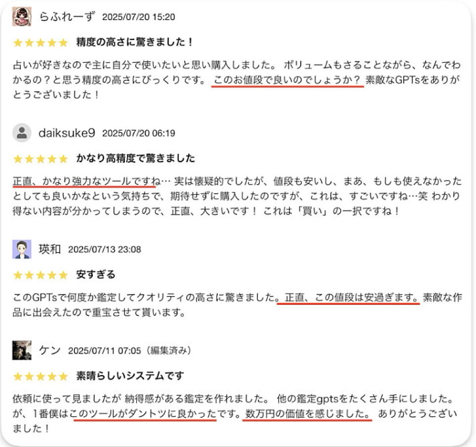 過去に試しに購入してみたこともありますが、ありきたりなAI占いで私が作ったものは段違いに精度の高いものでした。