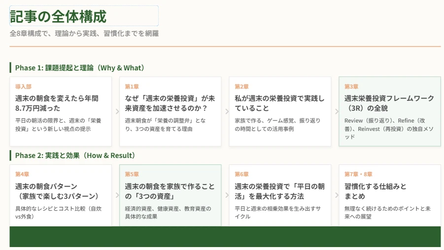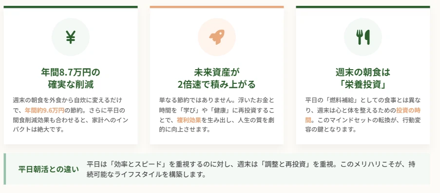 このように、週末の栄養投資は、健康、時間、お金という3つの側面から、あなたの未来資産を加速させます。