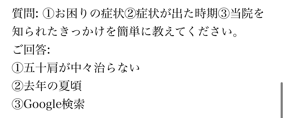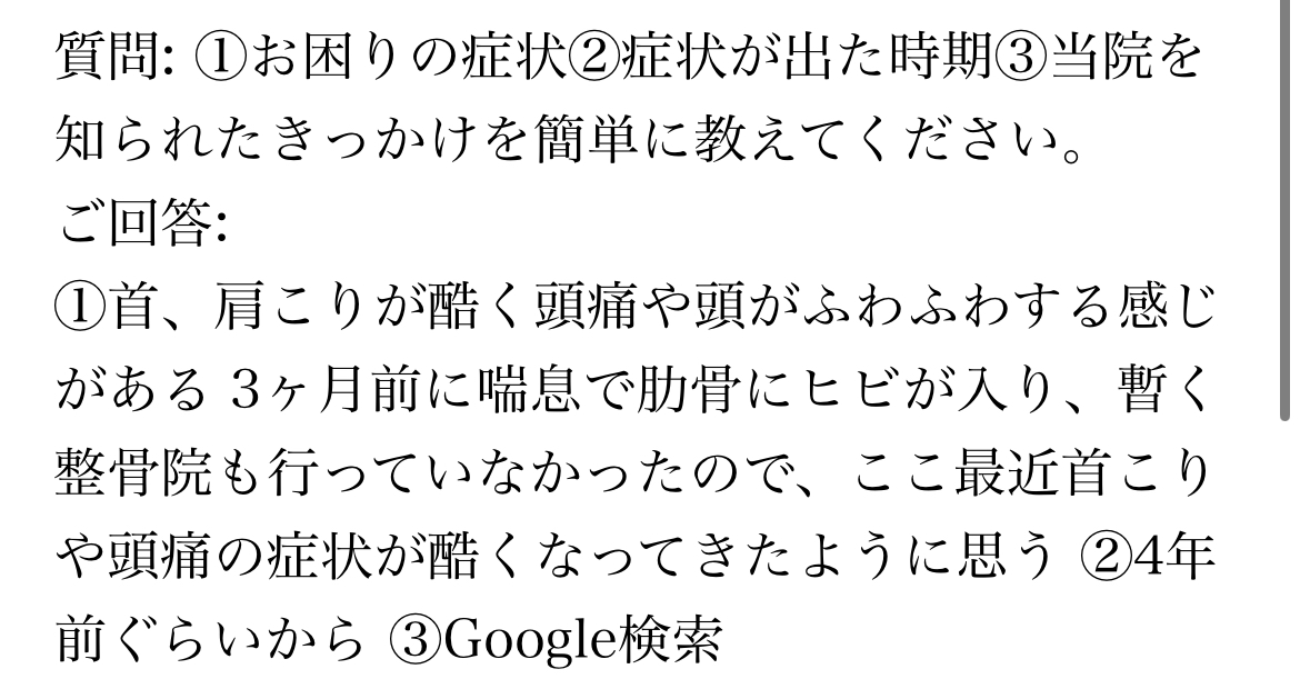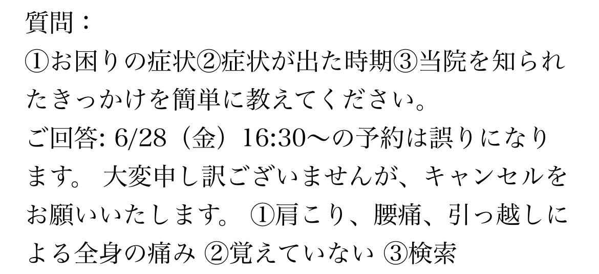 実際に当院にご予約頂いている方々の予約通知がこちらです。(しんきゅうコンパスのネット予約)ネット予約の時点でアンケートを入れることによってもしキャンセルになったとしても当院を見つけてくれた集客媒体を把握させてもらってます。広告費をかけずに安定してここまでの集客ができています。