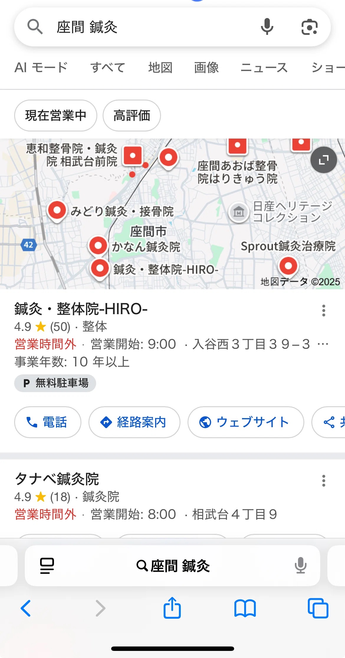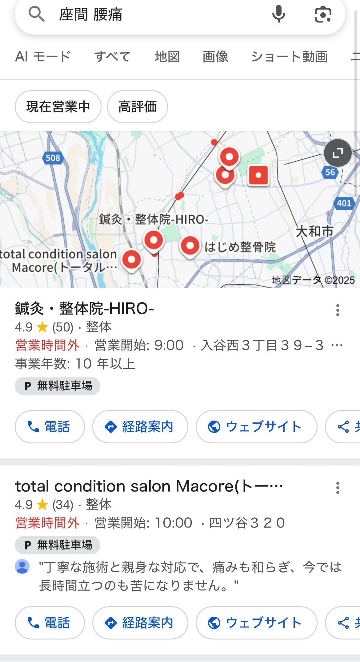 実際に調べてもらえると分かるのですが、当院は「座間 腰痛」「座間 鍼灸」「座間 整体」などと調べてもらえると基本スポンサーの一つ下の上位表示されます。
