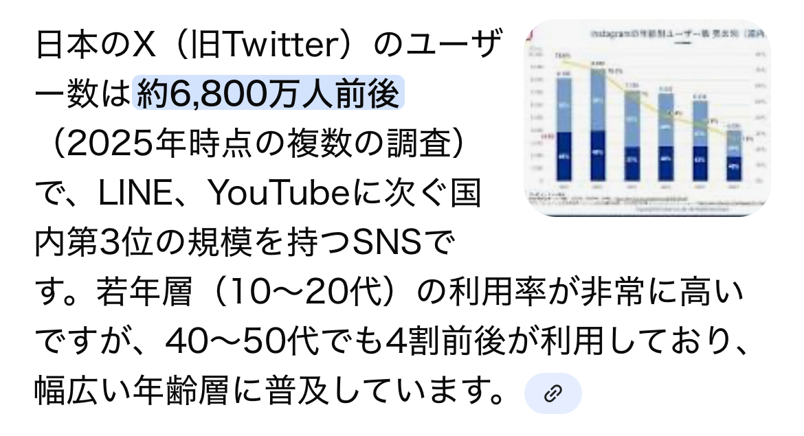 更に嬉しい情報が、Xの利用者数は日本だけで6800万人と推定されているみたいです。