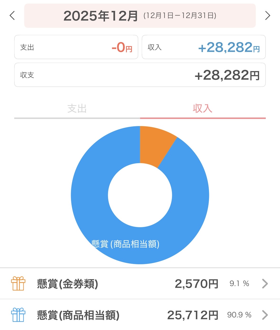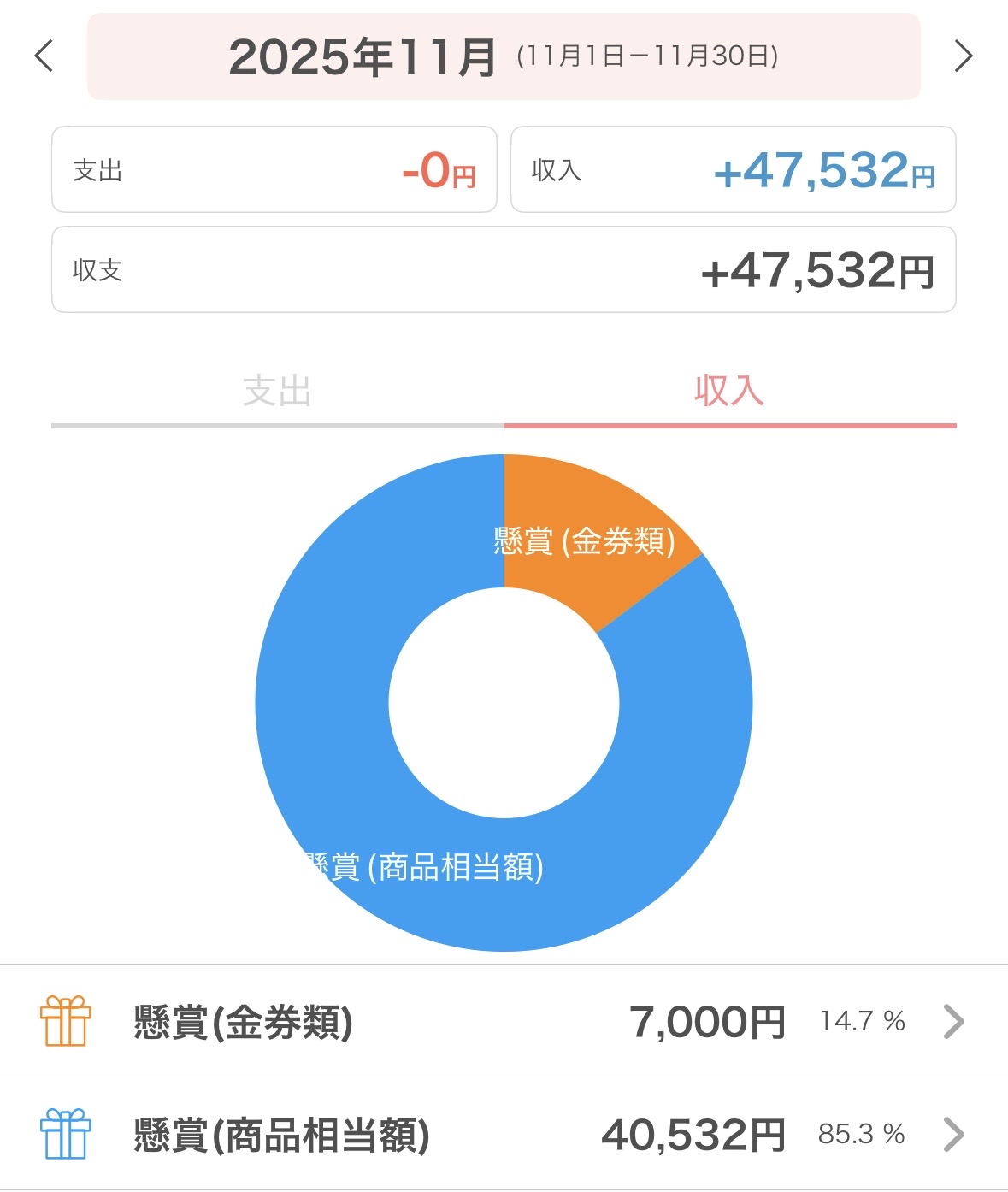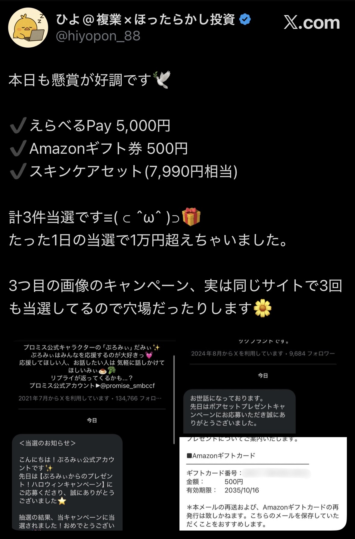 これまでに Amazonギフト券・スキンケア用品・食料品・日用品など、毎月1万円を超える当選を続けています。