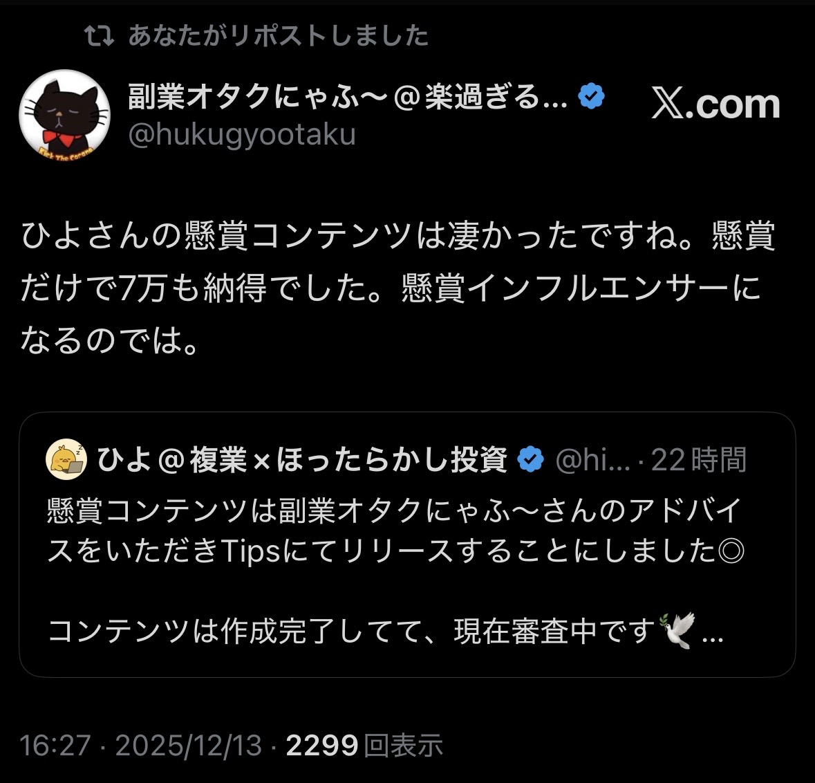 本コンテンツに関して、フォロワー数4万人超えの副業インフルエンサー『副業オタクにゃふ〜さん』にも以下のような感想をいただいております。