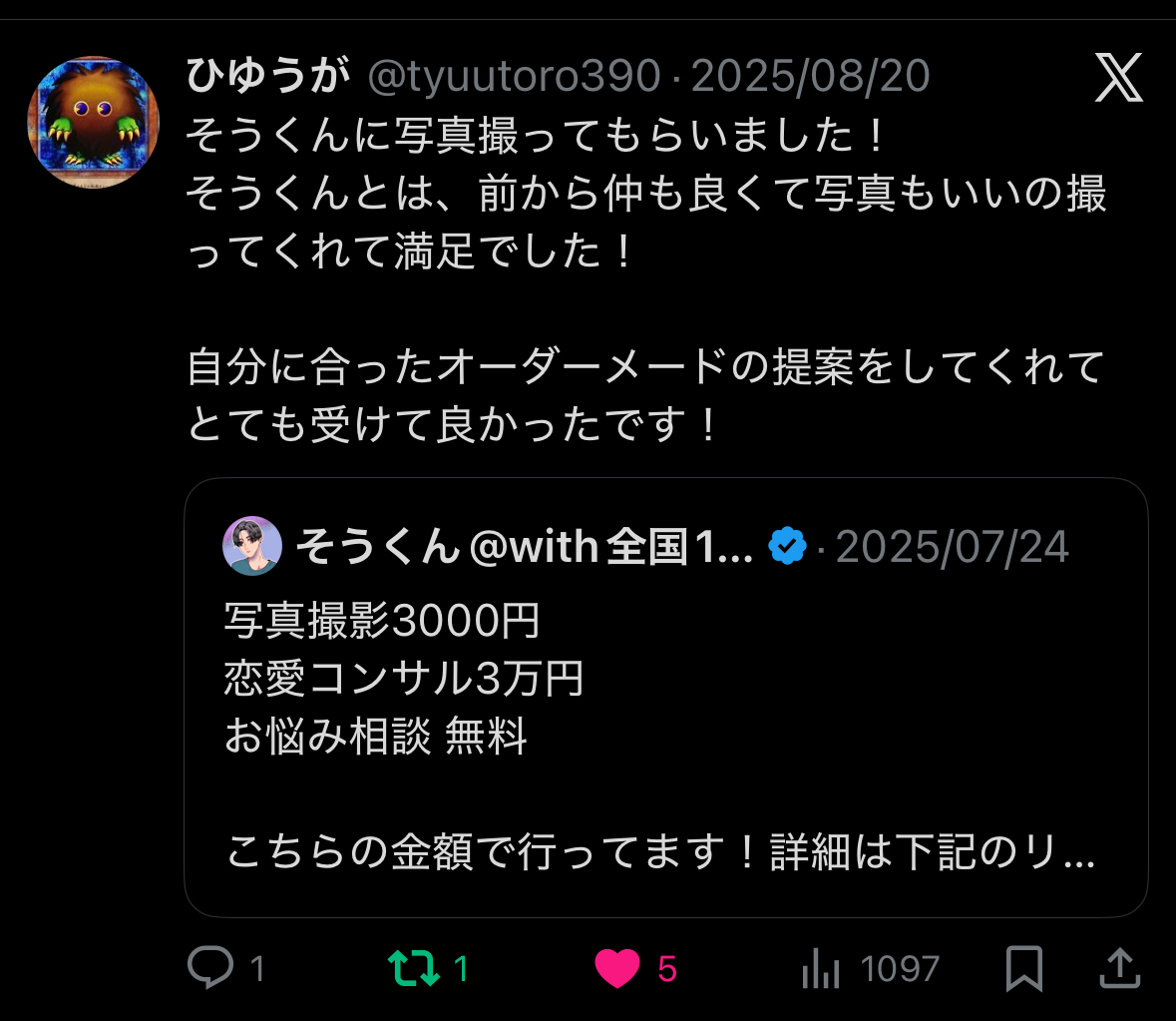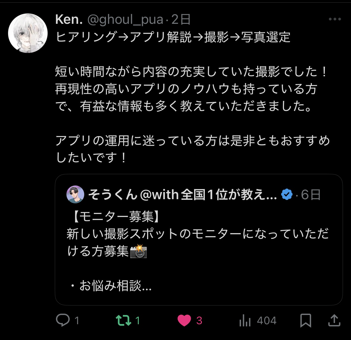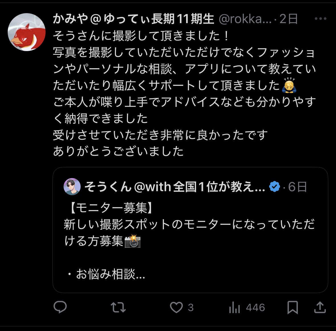 X(旧Twitter)DMにて、以下のいずれかを送ってください。写真撮影と無料面談をその日に行うでも大丈夫です!