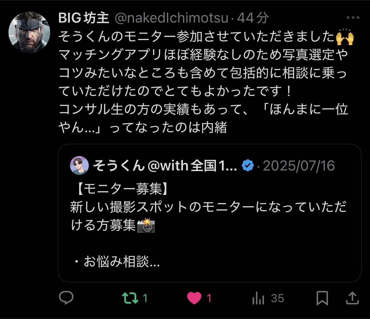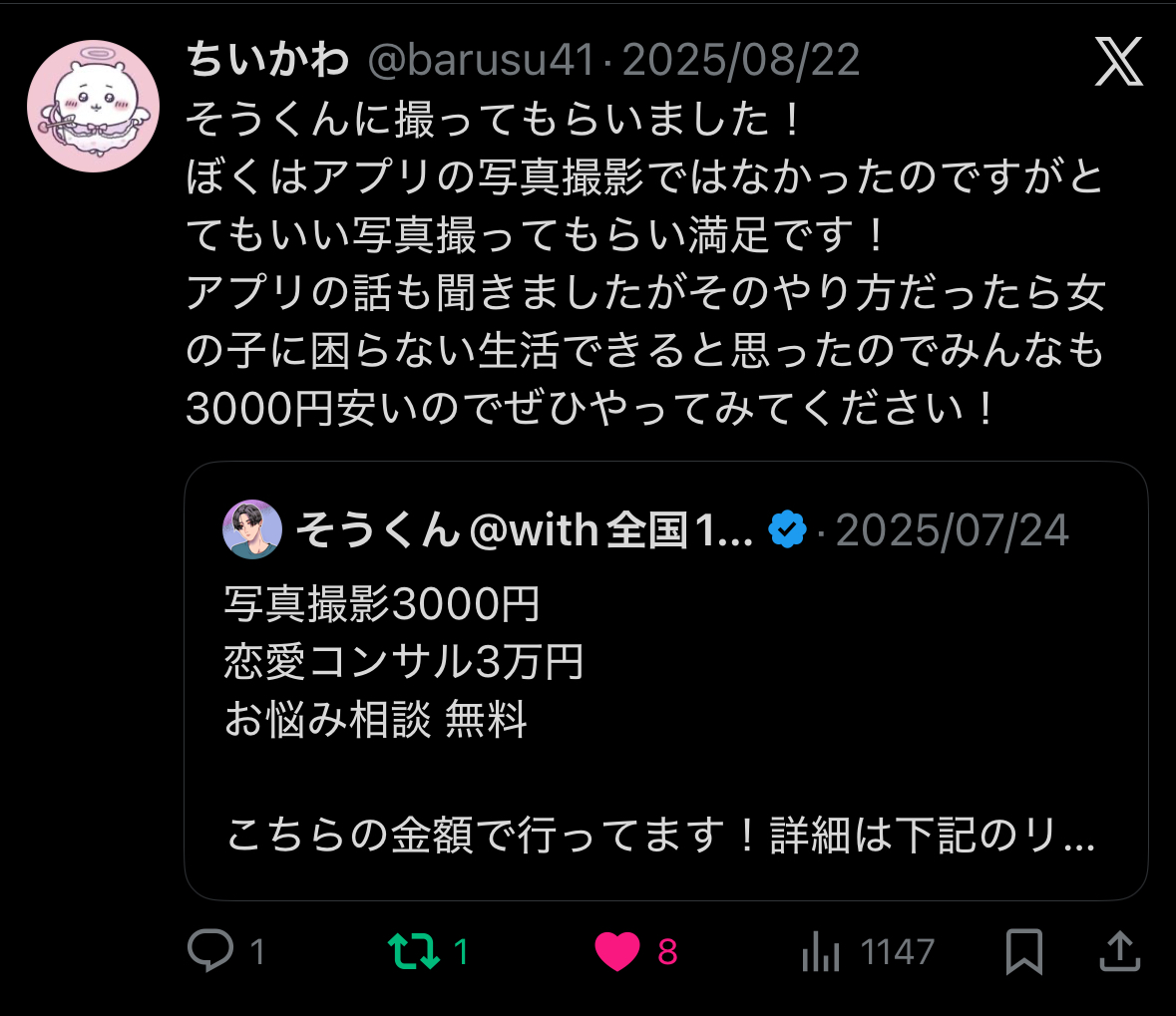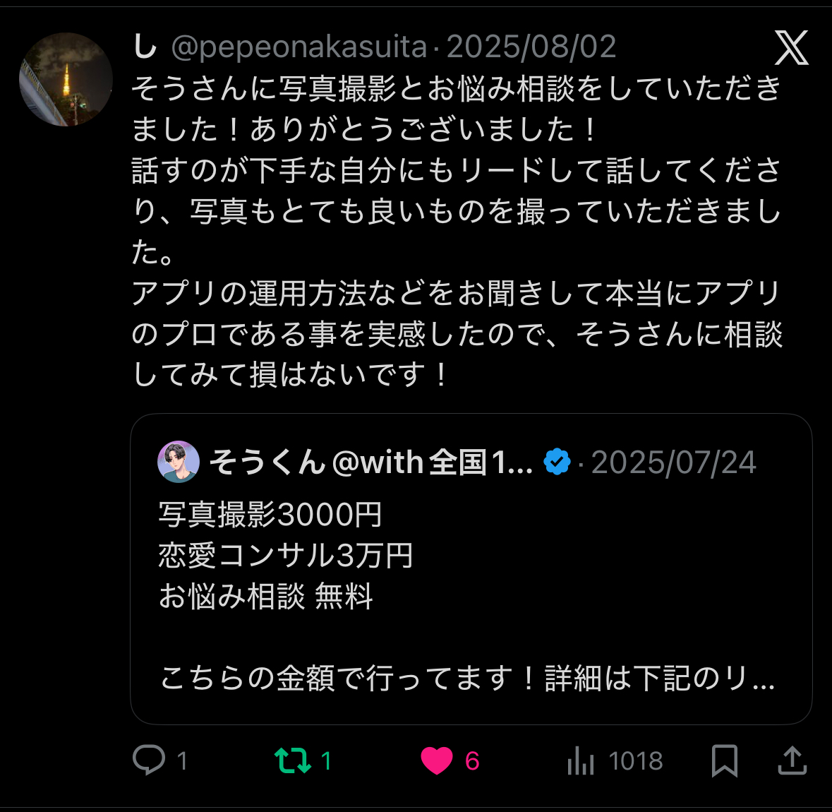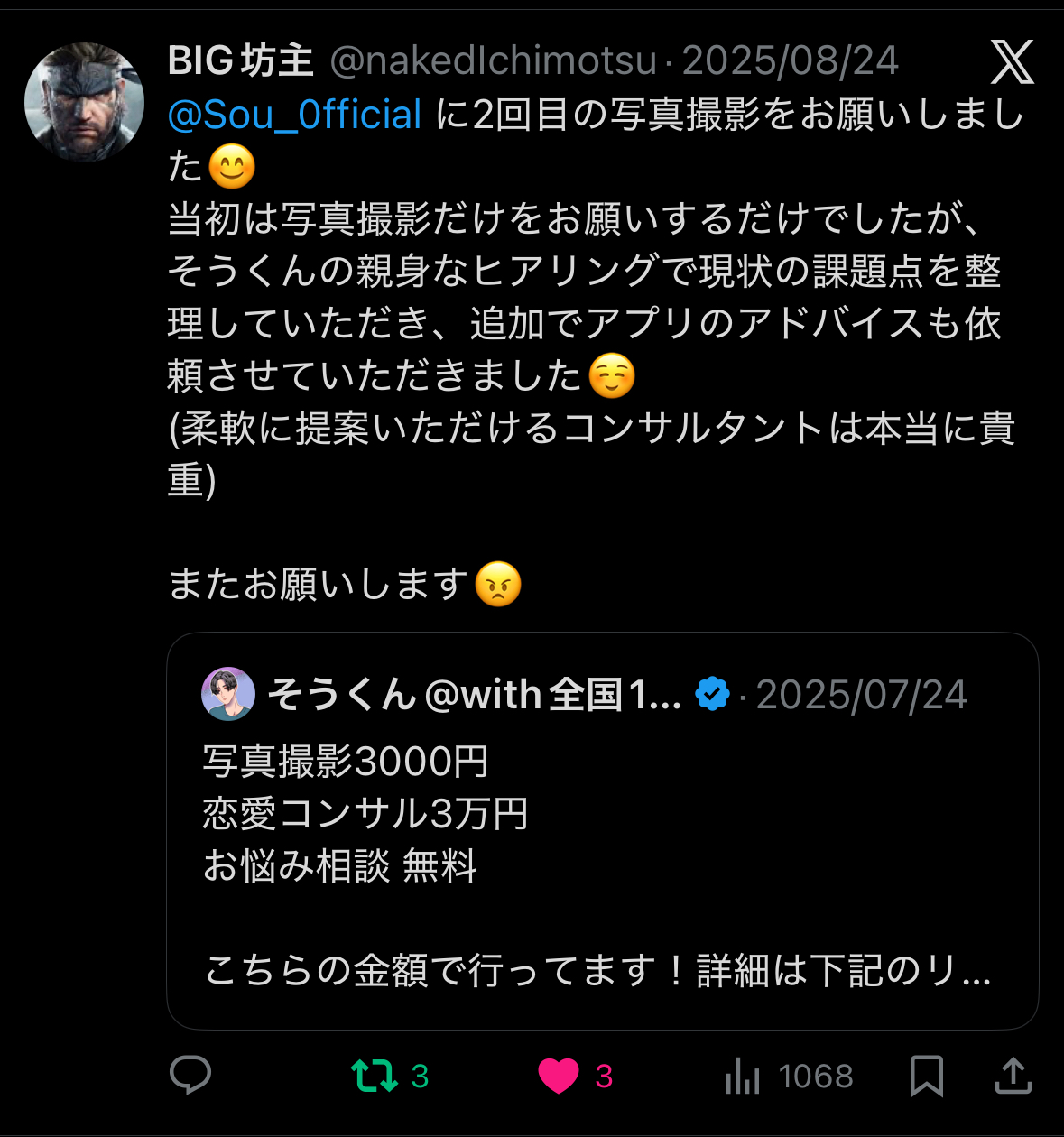 X(旧Twitter)DMにて、以下のいずれかを送ってください。写真撮影と無料面談をその日に行うでも大丈夫です!