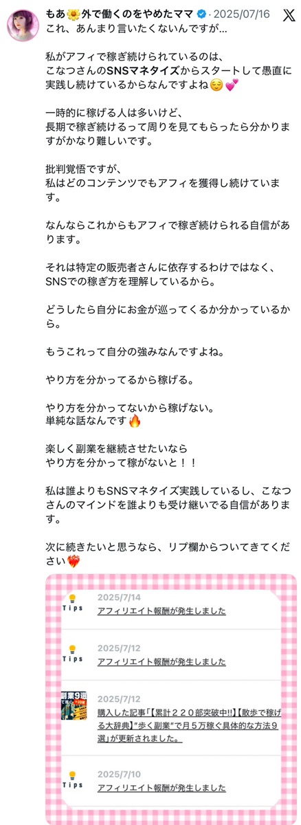 - 成功するためにやるべきことって、実はとっても簡単でシンプルで誰でもできることだったんです!これが分かれば、低学歴、凡人主婦の私でもできたので、誰でもXアカウントを育て、マネタイズし続けることが可能です!