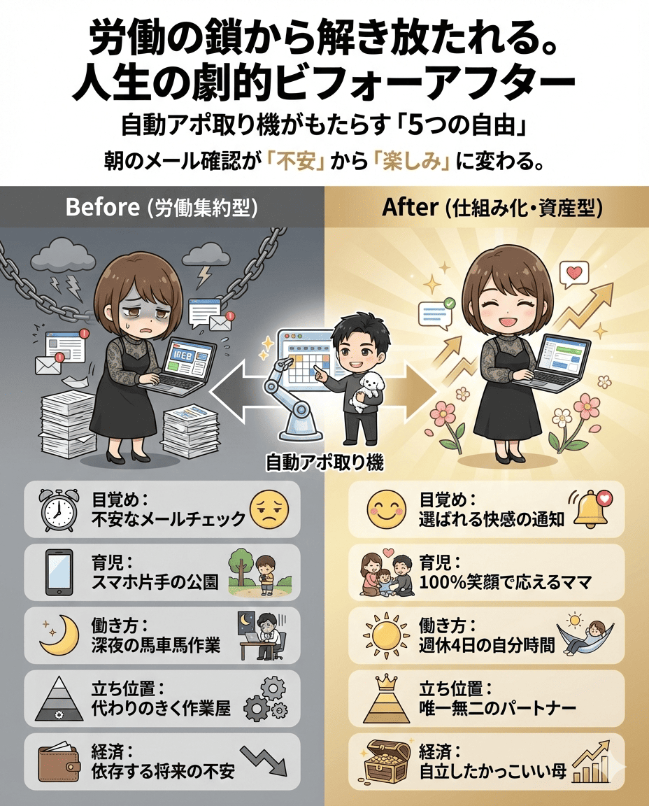 授業参観や公園で遊んでいる最中、もうスマホを気にする必要はありません。あなたが子供との大切な時間を楽しんでいる間も、「自動アポ取り機」がネット上で休まず働き、集客を代行してくれているからです。