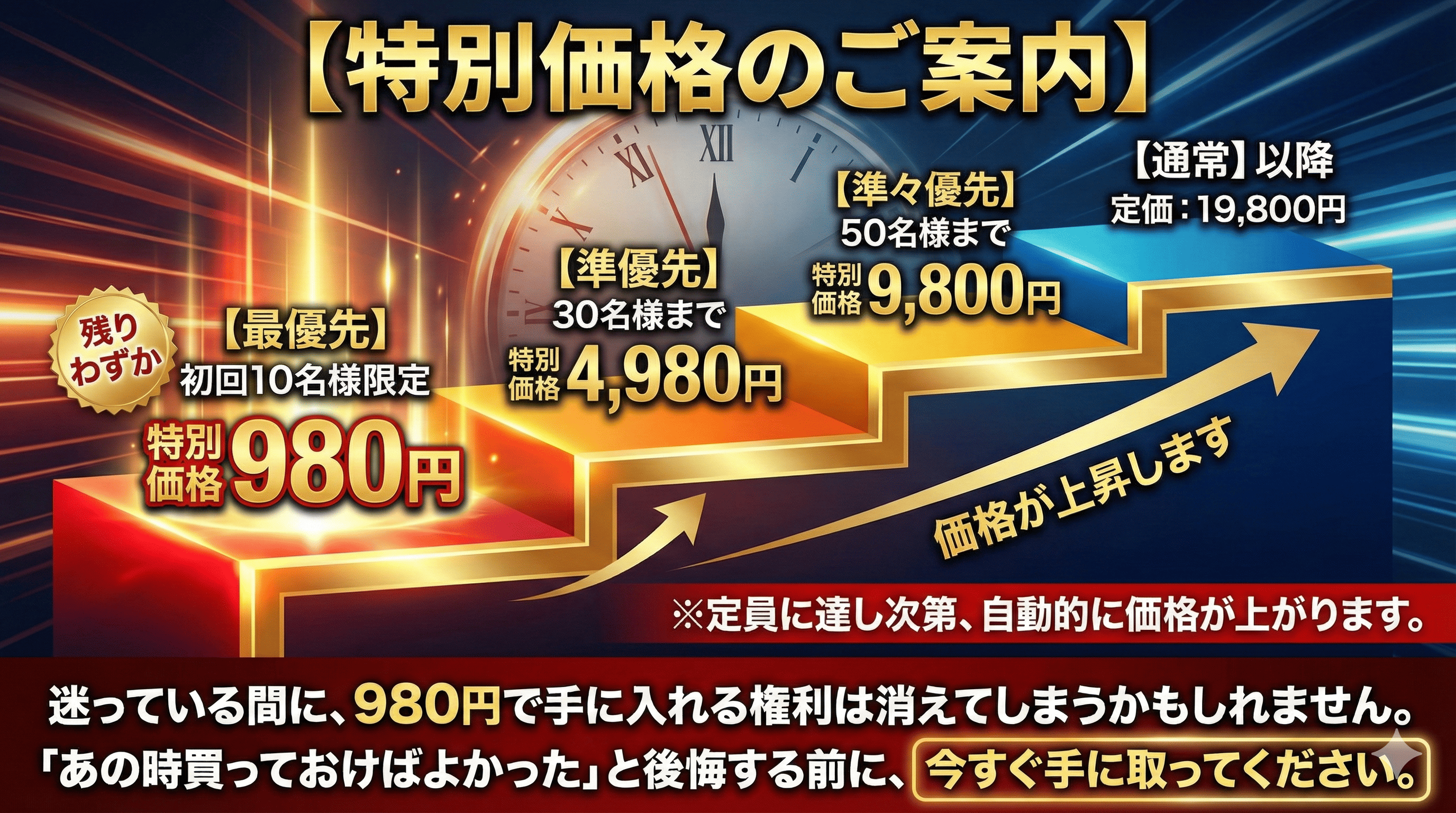 ※繰り返しになりますが、980円で手に入るのは最初の10名様だけです。初めにお伝えした通り、段階的に値段は変わっていきます。